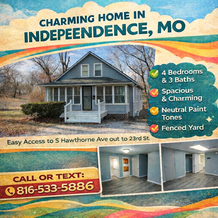 Charming 4-bedroom and 2 full baths home located in Independence, MO. Conveniently located with easy access to S Hawthorne Ave out to 23rd St. The home features, neutral paint tones, and windows that allow plenty of natural light throughout. The main level includes a spacious living area and a full kitchen with ample cabinet space and DISHWASHER, STOVE, REFRIGERATOR. The kitchen opens into a bright sunroom-perfect for relaxing or additional living space. The upper level is finished and offers additional living or bedroom space with carpet flooring and natural light. The home also includes interior stairs connecting all levels. Additional amenities include central heating & AC, washer/dryer hookups, a fenced yard, and a detached garage for extra storage or parking. The covered front porch and deck out back adds to the home\'s charm and curb appeal. Rent $1,500.00 - $1,500.00 Security Deposit We will require tenants who will take care of the property and treat and care for the property as their own. ****2-YEAR LEASE IS REQUIRED***** Small dog MAY be considered with a $25.00 monthly pet rent and pet screening. If a dog is allowed, the dog will need to be on a leash whenever outside and yard waste cleaned up at all times. 1 small dog under 20 lbs could be allowed with $25.00 per month pet rent and $300.00 NON Refundable PET FEE. Serious Applicants ONLY! Anyone over the age of 18 living at the property must put in a application. Property is RENTED AS-IS. No other improvements will be made. SECTION 8 WILL NOT BE ACCEPTED FOR THIS PROPERTY The tenant is responsible pays all utilities, electric, gas, sewer & water. Tenant will provide and maintain renters insurance, general care and general maintenance, i.e., smoke detectors batteries, light bulbs, co2 monitor batteries, filter changes, and maintaining the property as there will be 2 property inspections per year to make sure the tenant is in lease compliance. Tenant is responsible for lawn, snow, trash and all utilities. ***NO SMOKING of ANY KIND IS ALLOWED INSIDE THE PROPERTY*** Property is RENTED AS-IS. We are looking for a long term tenant to take great care of our beautiful home. View our website at CALL or TEXT now to schedule a showing with a leasing agent. ***** We will never ask you for a deposit or rent before you have viewed the property.*** Anyone who would be living in the property 18 and over is required to submit their application. Application Fee is $47.00 per person. All applicants are welcome to apply. The landlord does not discriminate based on source of income. Call for application. All application fees are NON Refundable. Once application is approved a non refundable reservation fee is required to take property off the market and hold it for your move in date that is to be within 30 days of your approved application. Avoid SCAMS, we do NOT advertise on Craigslist or FACEBOOK Market place. You will speak and meet with a leasing assistant! This property allows self guided viewing without an appointment. Contact for details.