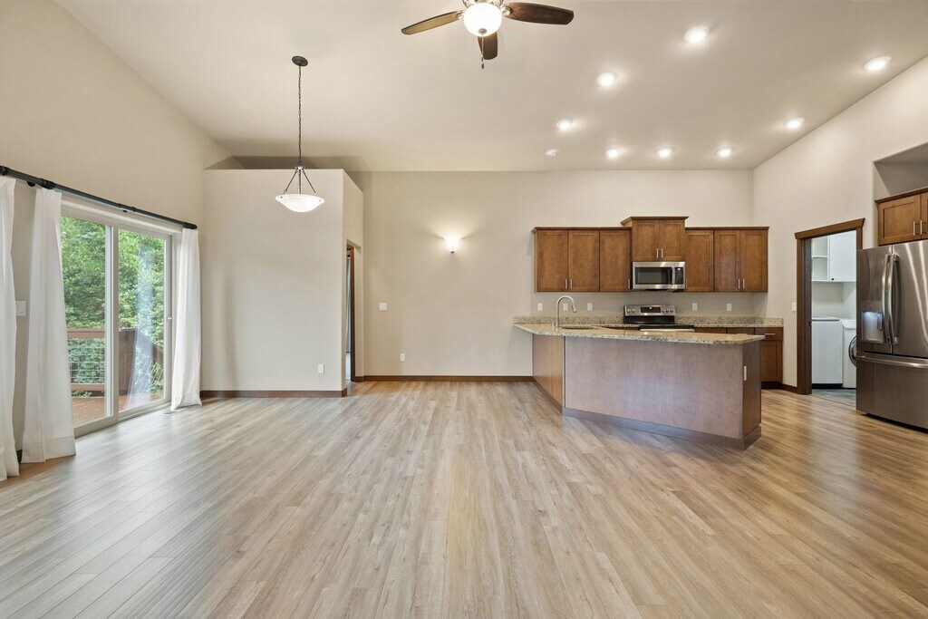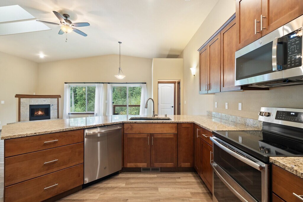This single-story home sits on a quiet greenbelt and offers a functional layout with vaulted ceilings and a gas fireplace in the main living area. The kitchen features a large island, quartz countertops, and stainless steel appliances. The dining area opens to a covered back deck overlooking the yard. The primary bedroom includes a walk-in closet and a five-piece bathroom. Two additional bedrooms and a bonus room provide flexible space for an office or extra room. The laundry room offers additional counter space and storage. An oversized garage adds convenience. Located a short drive from downtown Poulsbo. A full month’s rent, a security deposit equal to one month’s rent, and a $350 nonrefundable administrative fee are due upon move-in. For showings or questions, please email . Application guidelines and more information are available at