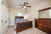 Home features a spacious formal dining room, a cozy family room with an electric fireplace, and an open dining area leading into the kitchen. The kitchen features a travertine backsplash, granite countertops, stainless steel appliances, a sizable pantry and a convenient utility room with wall cabinets. The generously sized primary suite with a coffered ceiling offers an ensuite bathroom complete with a tiled shower, jacuzzi-style tub, linen closet, and a walk-in closet with custom built-in cabinetry and shelving.