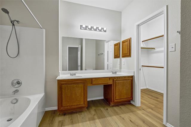 Charming 3-bedroom, 2-bath home in the desirable Villages of Woodlake, ideally located on a quiet cul-de-sac just steps from scenic ponds, walking trails, and the community pool. This move-in ready home features an open-concept layout with a spacious kitchen, breakfast bar, and a bright family room with large windows overlooking a private, tree-lined backyard. Flexible floorplan includes a formal dining room or optional second living area. The split primary suite offers a peaceful retreat with dual sinks, a garden tub, separate shower, and large walk-in closet. Secondary bedrooms are privately situated at the front of the home with a shared hall bath. Enjoy luxury vinyl wood-style flooring throughout, fresh paint, a new roof, and recent HVAC upgrade. Relax on the covered patio and take in the serene greenbelt views—perfect for enjoying nature and privacy. A wonderful place to call home!