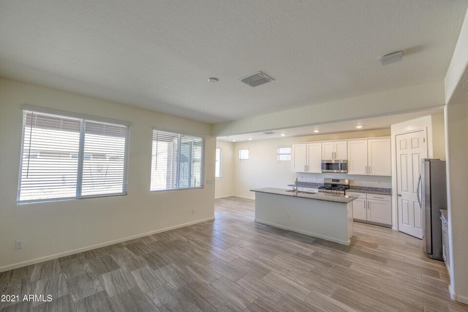 This thoughtfully designed single-level home features 3 spacious bedrooms,2 bathrooms,and a versatile den or office,perfect for remote work,a media space,or flexible living to suit your needs. The open-concept floorplan creates a bright,welcoming environment ideal for both everyday living and effortless entertaining. At the center of the home,the well-appointed kitchen showcases granite countertops,gas cooking,stainless steel appliances,and a generous walk-in pantry,offering abundant storage and workspace for cooking and gathering. The seamless connection between the kitchen,living,and dining areas enhances both comfort and functionality. Enjoy added convenience with a 2-car garage,RV gate,and low-maintenance yard,while the single-level layout provides easy living with no interior steps. Located in the highly desirable Asante community,residents enjoy nearby parks,walking paths,shopping,dining,and quick access to the Loop 303 freeway,offering the perfect balance of peaceful neighborhood living and everyday convenience. Beautifully maintained and move-in ready,experience the best of Arizona Living.
