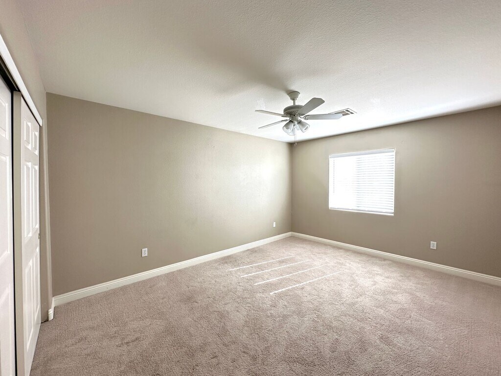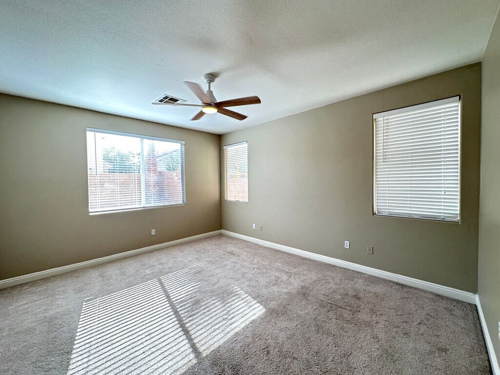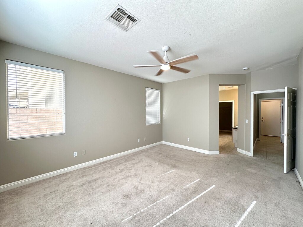 Beautiful 2-story home in Rhodes Ranch featuring 4 bedrooms and 3.5 bathrooms, including a spacious primary bedroom and bathroom conveniently located downstairs. The home offers a versatile loft, tile flooring throughout the first floor, and carpet upstairs. Located in a desirable guard-gated community with exceptional amenities. Price includes $50 for trash and sewer.