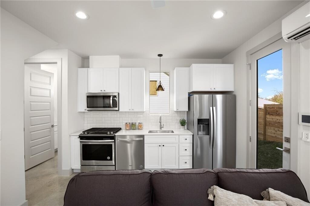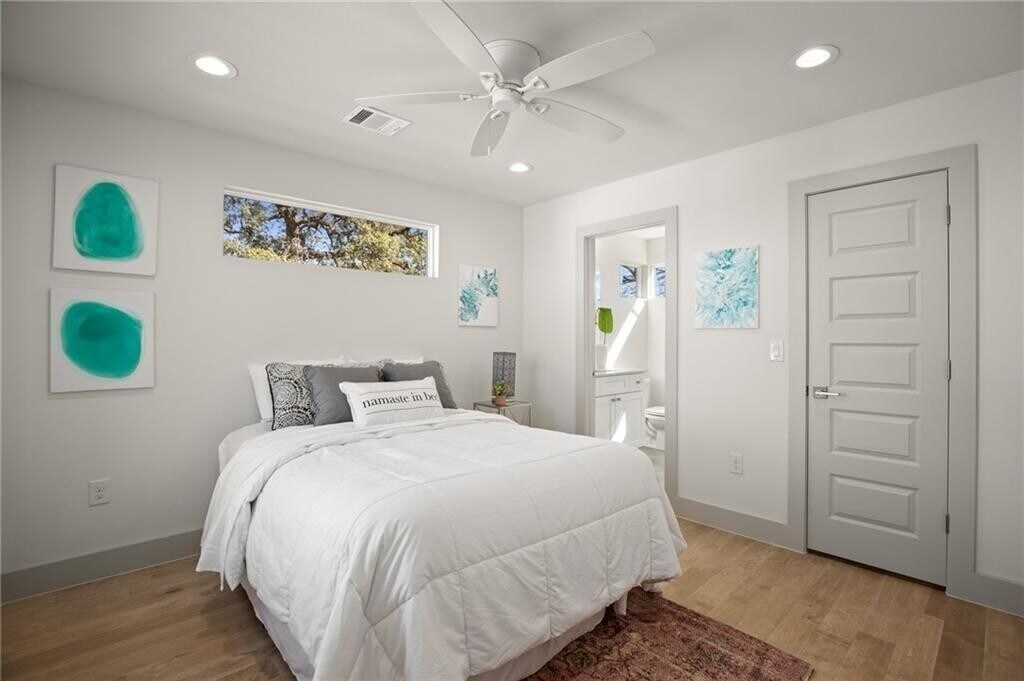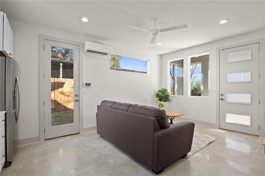 Situated in the vibrant and sought-after East Austin neighborhood, this modern condo places you just steps away from trendy restaurants, yoga studios, a lively food truck park, and more, offering an unbeatable lifestyle of convenience. While perfectly walkable, the home itself is tucked away on a peaceful street, providing both tranquility and privacy. Bathed in natural light, the thoughtfully designed floor plan includes a spacious yard ideal for outdoor relaxation and a perfect retreat for pets to roam freely. The home showcases sleek concrete flooring on the ground level and warm wood floors throughout the upper spaces, accented by designer tiles in the bathrooms. Each bedroom boasts a private en-suite, making it an excellent setup for hosting guests or sharing with roommates. The open and airy living spaces seamlessly flow into the large backyard, perfect for entertaining or unwinding. Additional modern amenities include spray foam insulation, energy-efficient natural gas systems, and high-efficiency AC. Please note, the photos feature staged furnishings, which are not included with the property. MLS ID 3088612