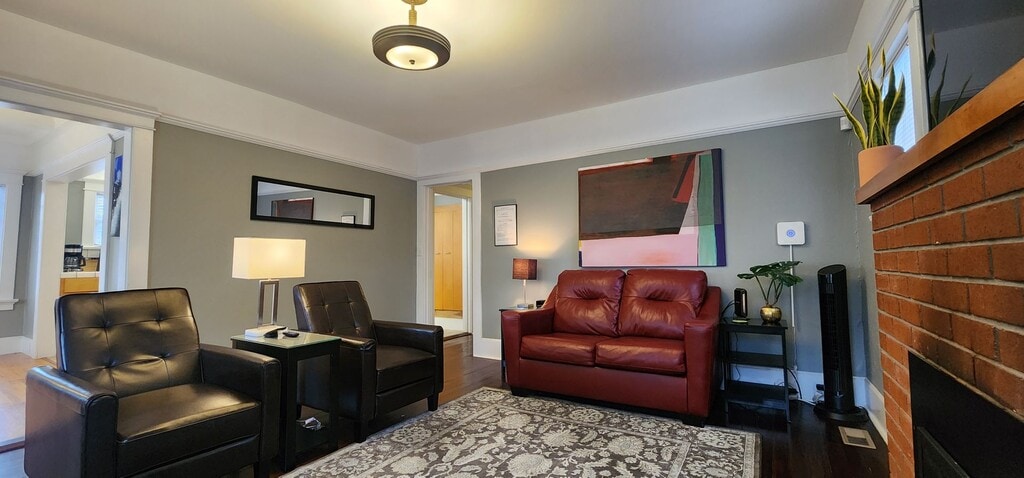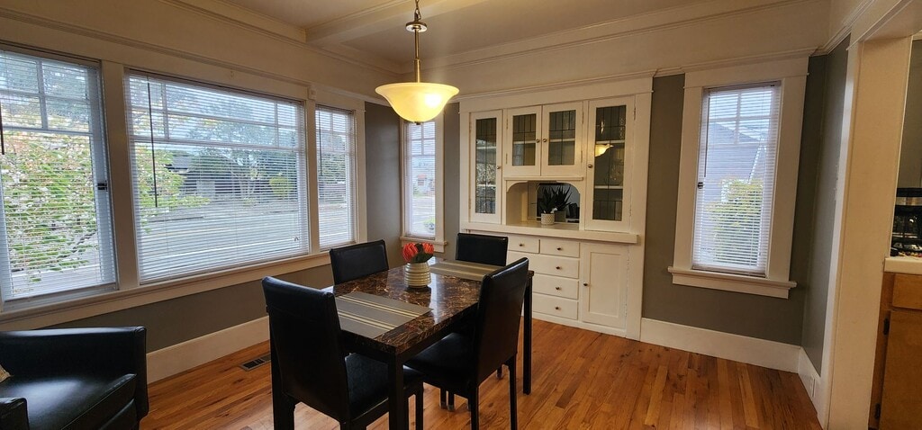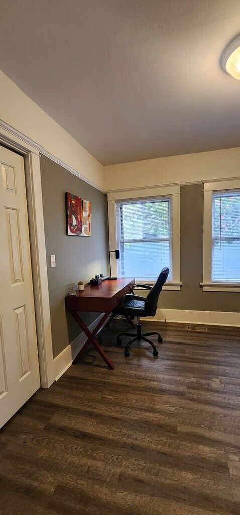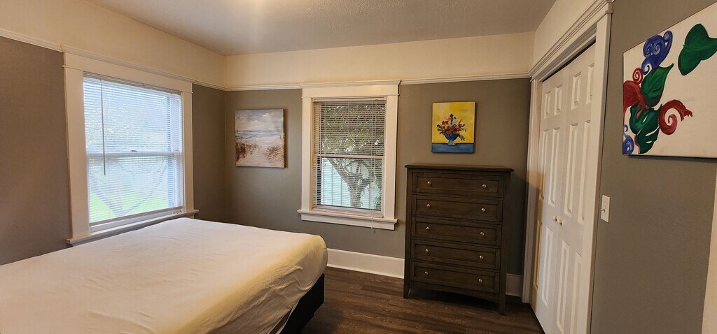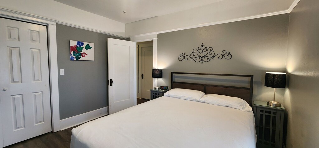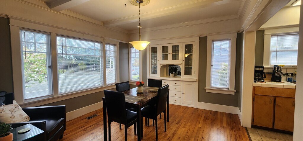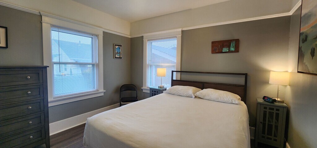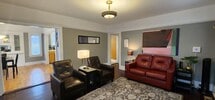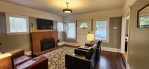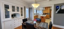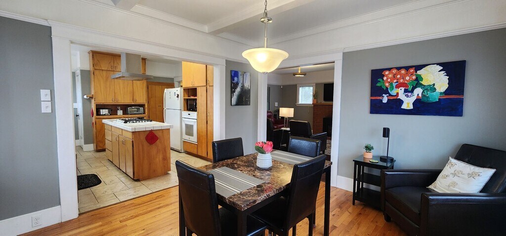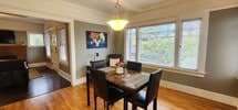 This lovely home features a wonderful front yard with mature landscaping, front porch for enjoying the weather. The Living room features gas fire place with remote control, comfortable seating and flat screen TV. The dining room as fantastic windows, lettings in a lot of natural light, built in hutch with lots of space around the table for entertaining. The kitchen is equipped with a lot of counter space, cabinet storage and oven, gas stove top, dishwasher and back door access to parking and the yard. The three rooms have space for queen size bed, dresser and nigh stances. The yard is fully fenced with a table and chairs for enjoying the days in the yard. Home is fully furnished.