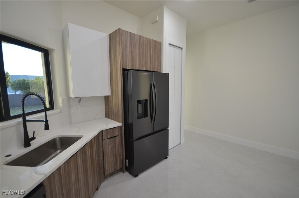 BEAUTIFULL LUXURY HOME Brand new 3 bedroom 2.5 bath at Cape Coral Metallic color standing seam roof that contains a 35 yr warranty 48x24 Porcelain floors all throughout home Insulated high impact windows and doors High efficiency 16 seer A/C Low consumption 40 gallon water heater White quartz counter tops in kitchen and bathrooms Modern LED lights throughout home Luxury quality faucets White kitchen cabinets with self-braking New stainless steel appliances Spacious & illuminated laundry room with a quartz countertop & sink Washer & dryer hook up with plenty of wall cabinets 2 Car garage with automatic opener that may connect via Wi-F