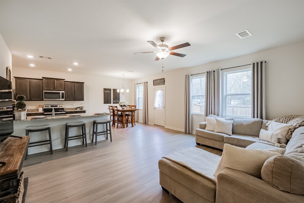Welcome home to this beautiful 2-story gem in the sought-after Williams Trace community! This modern residence offers the perfect blend of style and convenience. Step inside to find fresh vinyl flooring updates that add warmth and durability throughout. The open-concept kitchen flows seamlessly into the spacious living room,wonderful for entertaining. Stainless steel refrigerator and appliances are all included,making this home truly move-in ready. Enjoy the large,fenced backyard-perfect for pets,play,or relaxing evenings. With low utilities and low taxes,this property offers both comfort and affordability. The neighborhood has fantastic amenities,including a charming play park and splash pad,perfect for family fun. Conveniently located near FM 1488,you’re minutes away from shopping,dining,and all the essentials. This home is zoned to the highly acclaimed Magnolia School District. No back neighbors! ASSUMABLE MTG RATE 3.875%!!!!!!!!!!! MLS# 75732271