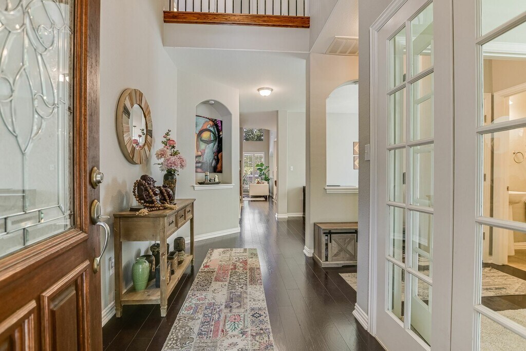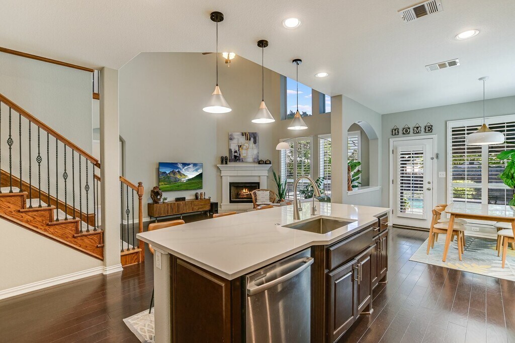 Welcome to 2417 Turtle Mountain Bend, a private, resort-style retreat in the heart of Austin, with thoughtful upgrades that elevate daily living and entertaining alike. From the moment you step inside, soaring ceilings, rich hardwoods, and abundant natural light set the tone for a home that feels polished, warm, and effortlessly livable. The open living spaces flow beautifully, anchored by a cozy gas fireplace and oversized windows with plantation shutters framing peaceful views of the backyard oasis. The kitchen is designed for hosting, featuring quartz countertops, refinished cabinetry, an updated gas cooktop, a new sink, and a generous island with breakfast bar seating. A formal dining room, sunny breakfast nook, and versatile front sitting area offer flexibility for everything from dinner parties to morning coffee. Need a true work-from-home setup? The dedicated office with French doors delivers privacy and focus. The primary suite is tucked on the main level with serene backyard views and a spa-inspired bath with dual vanities, granite counters, soaking tub, and separate shower. Upstairs, you’ll find a large game room, a true home theater with projector and surround sound, plus three additional bedrooms and two full baths. Outside is where this home truly shines: a heated pool and spa, two covered outdoor living areas, and professionally designed landscaping and lighting that make evenings feel magical. A storage shed conveys, and the garage is even more functional with a newly added mini-split, perfect for a gym, workshop, or comfort-controlled storage. Recent improvements include roof (2024), new exterior paint, new garage door, updated lighting, interior paint, shutters on all windows, and HVAC enhancements. All of this is set in the desirable Bridges at Bear Creek neighborhood, close to shopping, dining, parks, and top-rated schools. This one checks the boxes, then adds a few you didn’t know you needed.