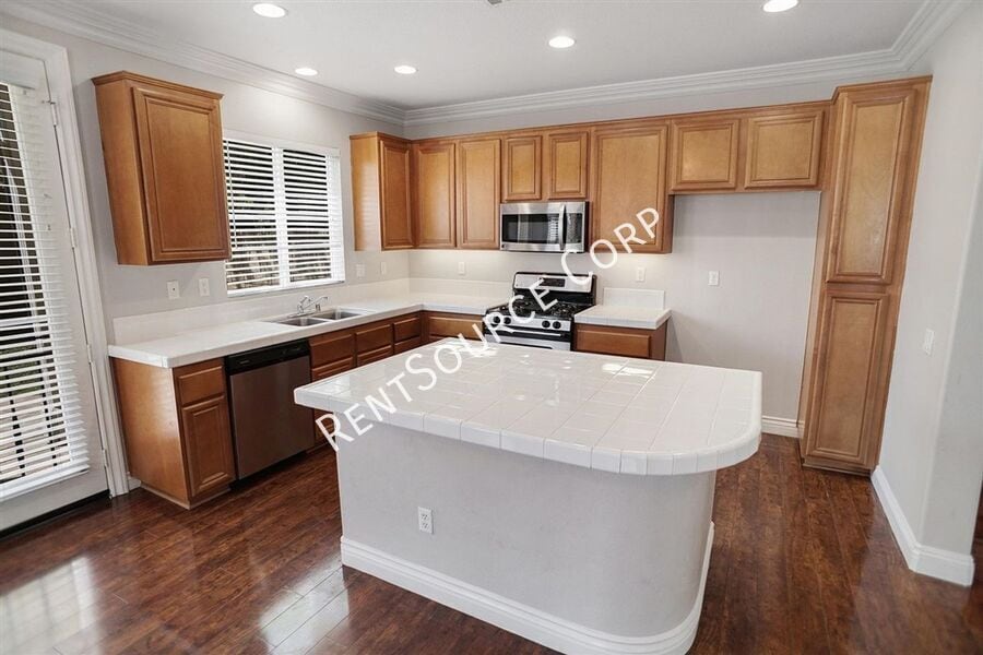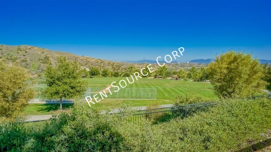 Santa Clarita Rental located in Tesoro Del Valle / Tango Community. 4 bedrooms, 2.5 baths, 1941 sq. ft. Upon entry you will find a cozy living room complete with fireplace. The kitchen is spacious and overlooks dining area along with a large breakfast bar and lots of cabinets, stainless steal appliances and wood flooring throughout house. Upstairs you will find the large master suite with attached bathroom complete with deep soaking tub, walk in shower, his and hers sinks and walk in closet. 3 more bedrooms upstairs share the hall bathroom with tub and shower combo. The full sized laundry room with large closet is also located on the second level. The backyard has beautiful city views with plenty of grass and a stone patio. 2 car attached garage. Close to schools. HOA offers 2 community pools, resort style clubhouse, playground, soccer field, BBQ area, man made lake and other amenities. Available NOW! Washer/Dryer included without warranty HOA and Gardener Included. Will Consider Small Pet. Please visit