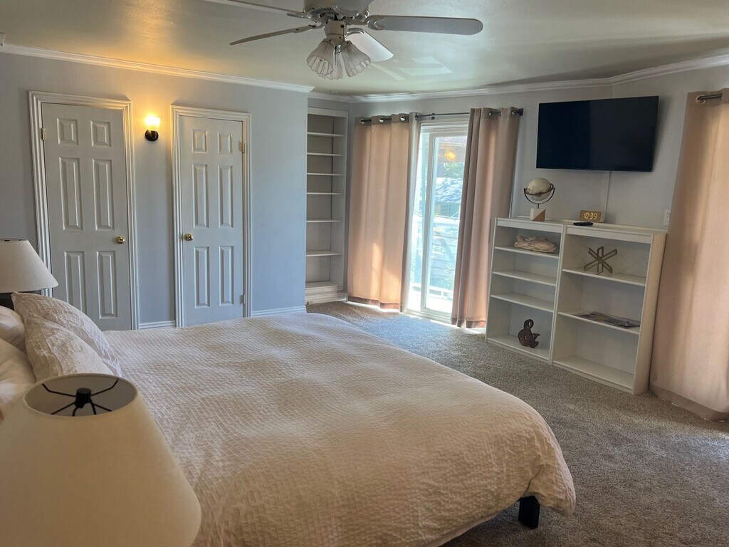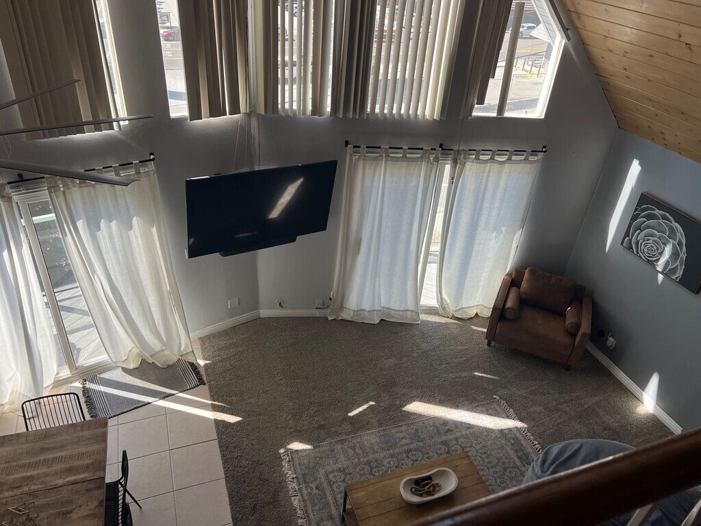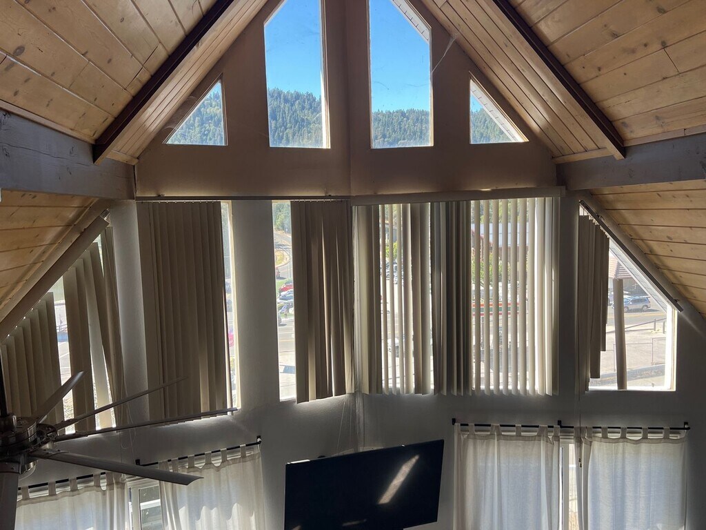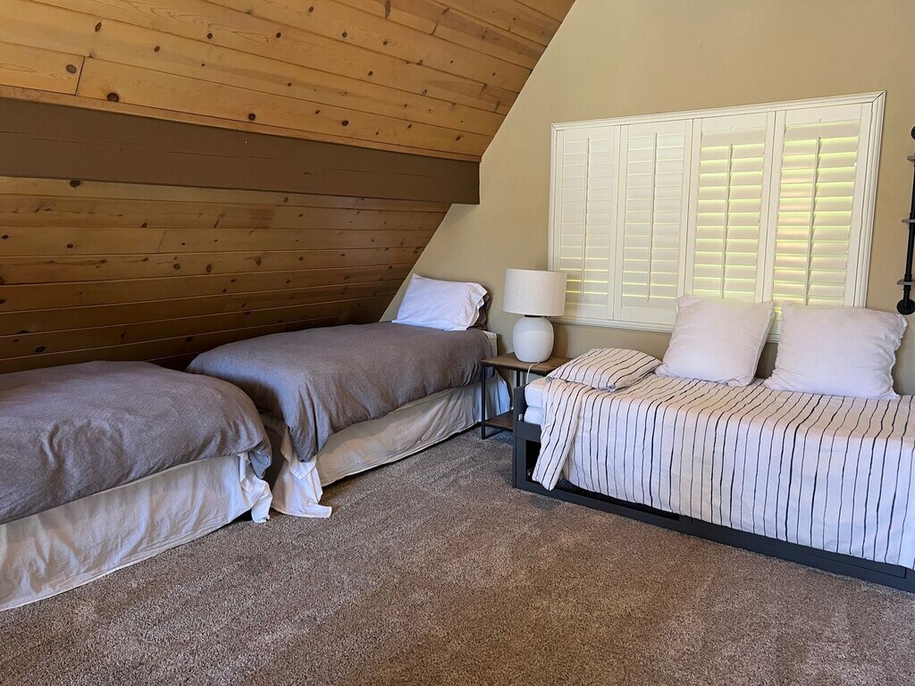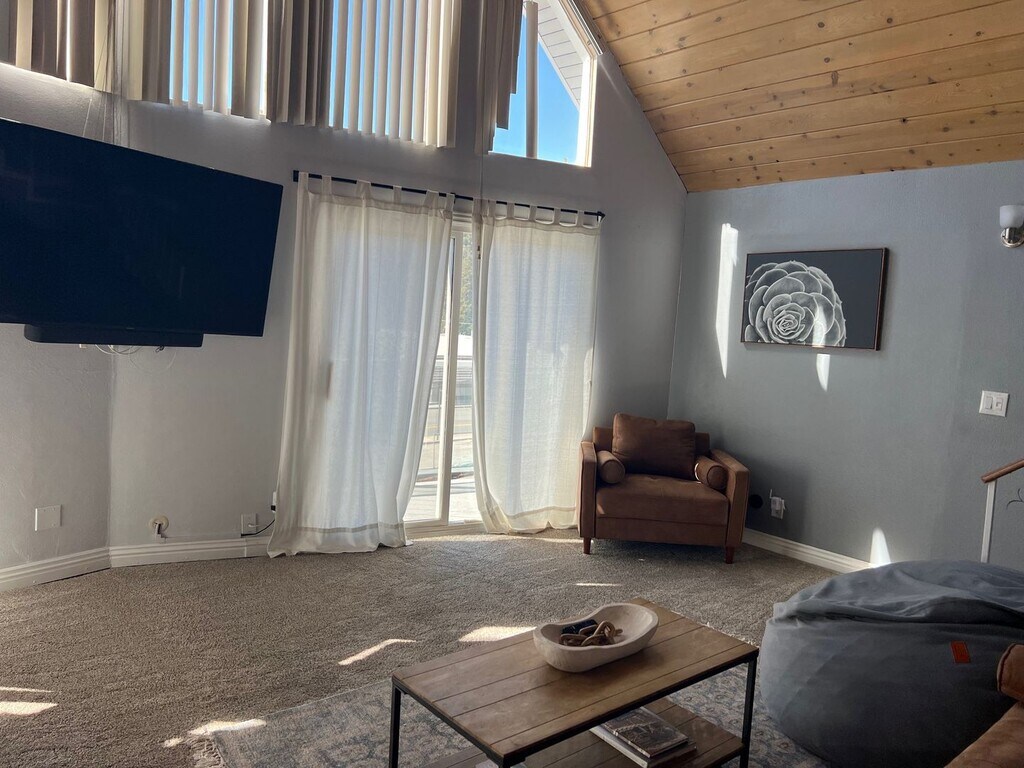 This house is less than a block away from Lake Gregory Park, Goodwins Grocery, and so much more. On the entry-level, you have a spacious master suite with a private deck. Previous renters have watched the fireworks from the decks. On the main floor, the A-Frame style windowed wall compliments your living room & kitchen with breakfast bar counter, to allow for sun-filled fun for everyone. This windowed wall boasts of a forest-skyline and a lake view, especially from the sunny deck on to which the living space opens up. Also on the main floor, there is a full bath and a second bedroom. The loft is a perfect space for a game room, a third bedroom, office, or any other dreams you may have. Level with the road is a two-car detached garage that has running water and power. It is set up to be a great workshop and has been used as an extra entertainment space. Behind the house is a yard that is ready for outside activities. Renter pays $34 toward trash and $59 toward sewer each month.