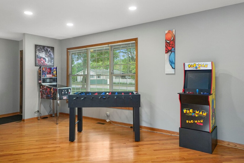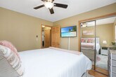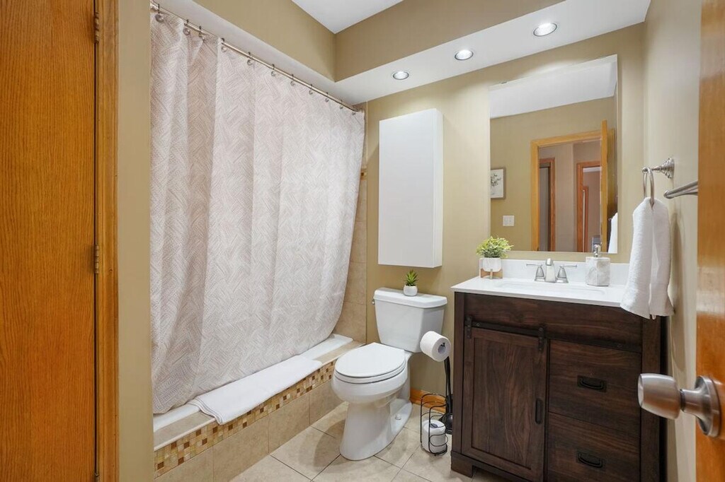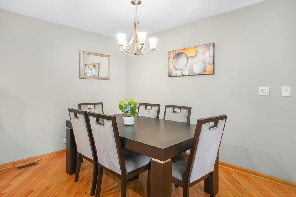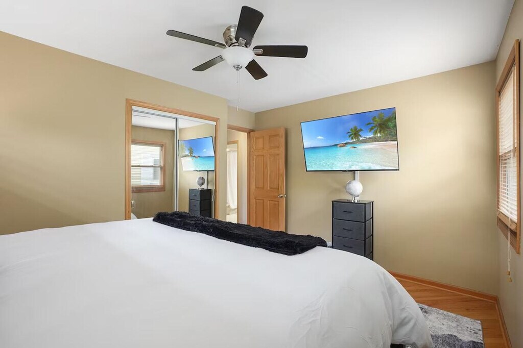 This spacious 1800 SF single-family home is conveniently located near O'Hare Airport, Schaumburg, and Hoffman Estates, offering easy access to a variety of bars and restaurants. The property features four bedrooms and two full bathrooms, with a master suite that includes a king-size bed and three additional rooms with queen beds. An air mattress is also available on-site, providing a total of five beds. The home is equipped with plenty of kitchen utensils, including cooking spices and oils, making it a perfect choice for families and tech enthusiasts alike. The home boasts a nice layout with a fenced yard, a patio for hosting outdoor BBQs, and a two-car garage with additional street parking. It is well-equipped for children, featuring a pack & play sleeper, a stroller, a high chair, and a booster seat. Technology lovers will appreciate the five LCD televisions with access to Hulu, Disney, ESPN, Netflix, and Prime Video (with your login), a sound bar in the living room, and Wi-Fi throughout the entire home with up to 300 MBPS internet speed and an ethernet hard line available. The property includes a two-car garage and street parking, providing ample space for your vehicles. Additional amenities for children, such as a pack & play sleeper, stroller, high chair, and booster seat, are available to enhance your stay. Situated near O'Hare Airport, Schaumburg, and Hoffman Estates, the home offers convenient access to a wide range of dining and entertainment options. The neighborhood is ideal for exploring local attractions and enjoying the vibrant community life. Check-in requires submission of ID and security fees, and failure to do so will result in no refunds or access to the property. Fees may vary for long-term stays. Reservations are not accepted without security fees paid upfront, with no exceptions. The home is equipped with high-speed internet up to 300 MBPS and an ethernet hard line, making it suitable for remote work. A laptop computer is not included. [SI]