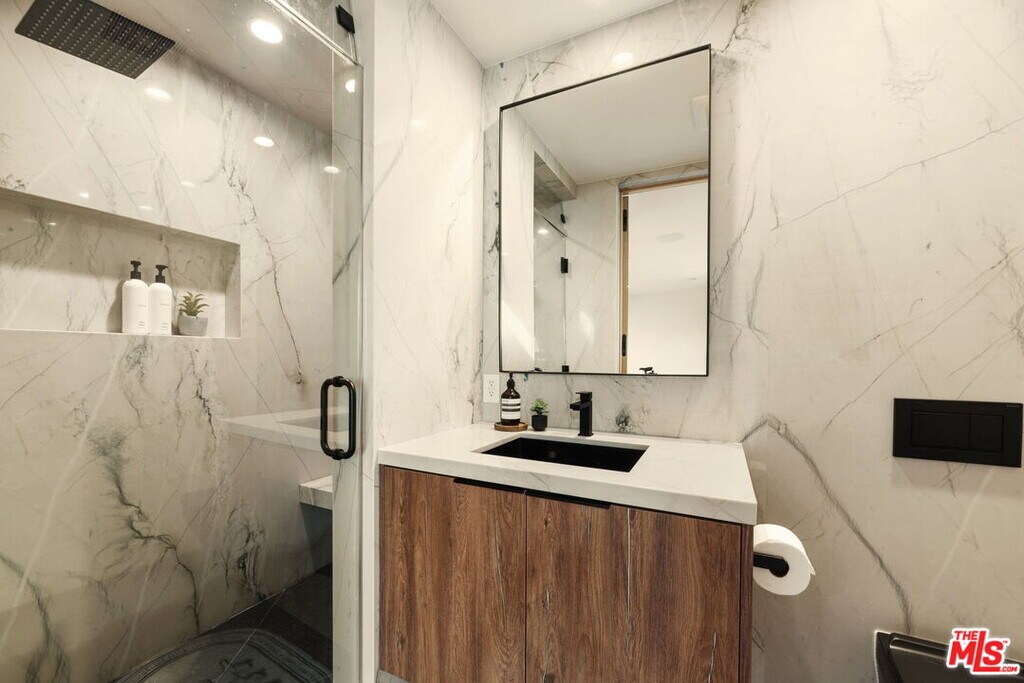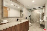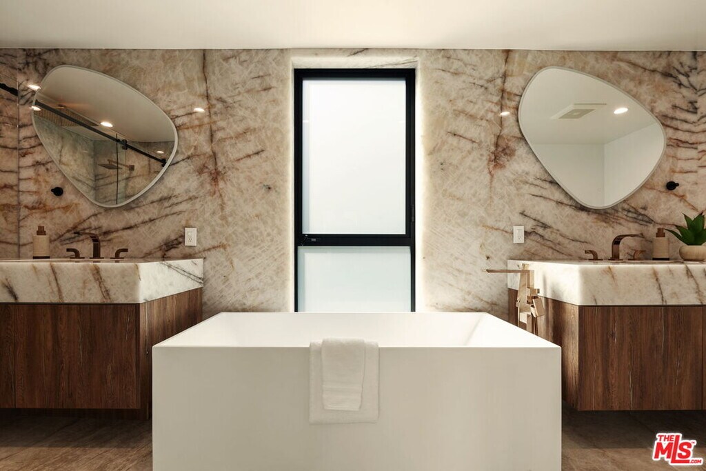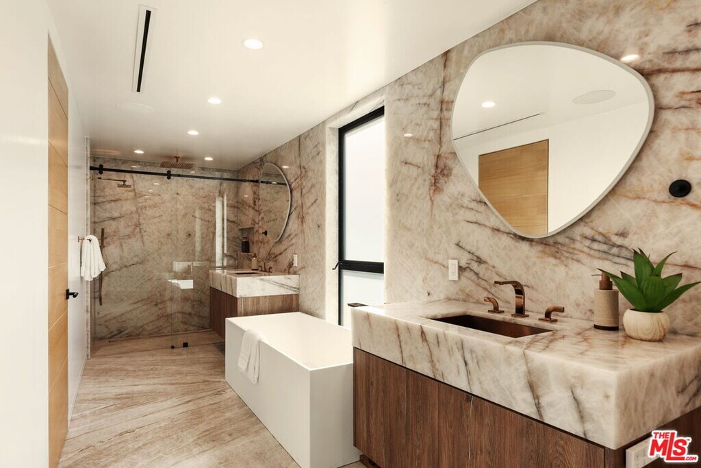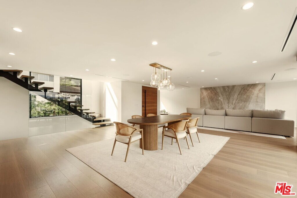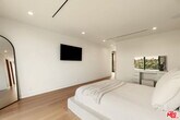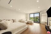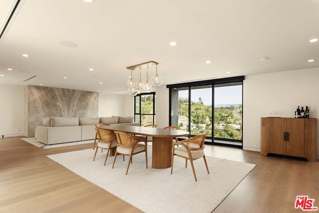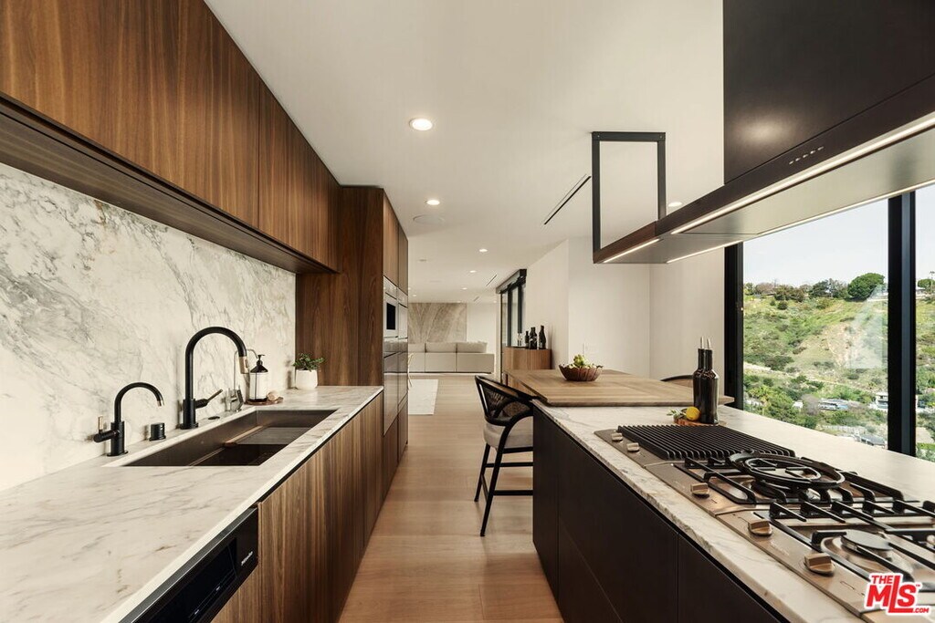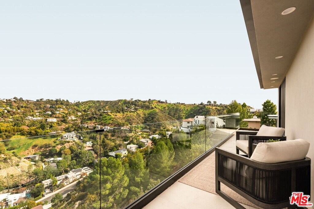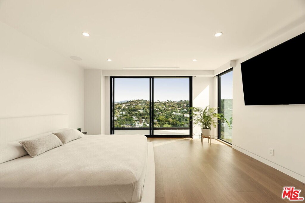 Located in the coveted Mount Olympus neighborhood of the Hollywood Hills, this completely remodeled 4-bedroom, 4.5-bath modern home offers spectacular city and canyon views in a serene setting. The open floor plan is designed for both everyday living and entertaining, featuring a gourmet kitchen with all Miele appliances, a built-in espresso machine, custom Italian cabinetry by Molteni & C, and Taj Mahal marble countertops and a breakfast bar for casual dining. The open floor plan includes a dining area and living room with a fireplace, opening to balconies offering views from every room. The downstairs level opens to a brand-new deck with a spa, fire pit, and outdoor kitchen complete with a built-in BBQ, cooktop, refrigerator, and new teak furnishings. There is a den/ office and a steam shower to use after a workout in your own personal gym. All main bedrooms are located on the top level - primary suite and secondary bedrooms feature custom walk-in closets, while spa-inspired baths include high-end stone finishes and heated floors. Additional highlights include real hardwood floors, built-in Sonos speakers, motorized Lutron shades, a workout room, movie theater/media room, security system, and two electric vehicle charging stations. Prime location in Los Angeles offering privacy and tranquility, yet just moments from the Sunset Strip and city conveniences. MLS# 26641017