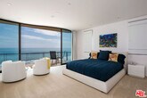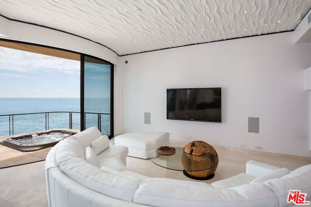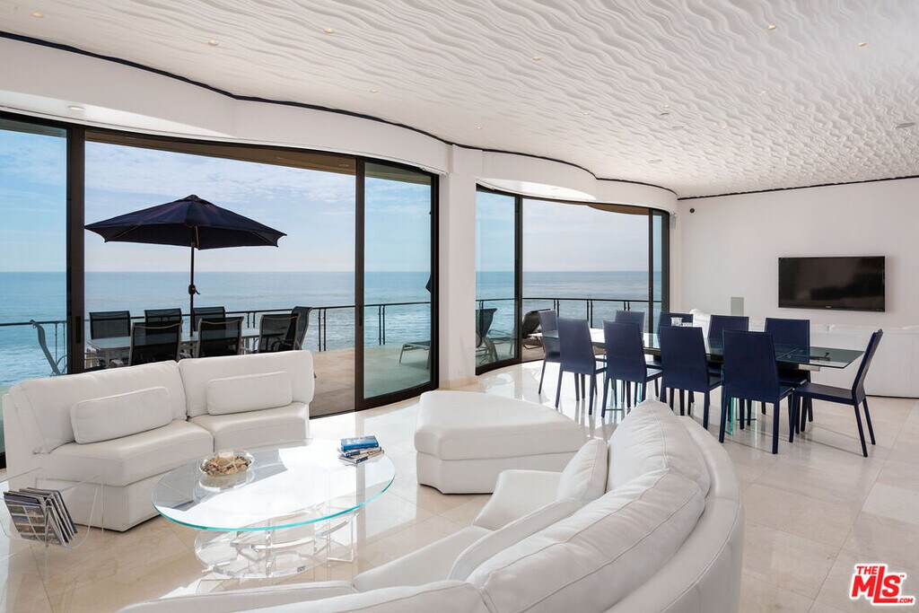 Dolphin House with celebrity style, and 55 feet of Malibu Road beach frontage, Sinuous curves, white marble floors, and sleek contemporary furnishings. Walls of glass and two spacious beachfront balconies take in the expansive ocean and island panorama. The main living area is wide, curved Fleetwood stacking glass doors open onto a full-width deck complete with Jacuzzi, Lynx barbecue. The living area comprises two seating areas with exquisite Italian leather furniture, two flat screens, and a fireplace (one of four in the home). Between the sitting areas is a stunning glass dining table for ten guests, and adjacent to that is a fully equipped and stocked horseshoe-shaped bar with a beverage cooler, custom chandelier, and bar seating. The dual-island gourmet kitchen features wood cabinets, rare granite, and onyx countertops, top-of-the-line appliances, an indoor grill, a dumbwaiter to the second-floor kitchenette. Upstairs, accessible by steps or elevator, are three suites, two with ocean views and curved glass doors onto another full-width deck, and one suitable as an office, media room, or guest suite. Lavish spa-style bathrooms, equipped with integrated smart-home amenities, air conditioning, radiant floor heating, security, a two-car garage, standby generator, intercom, and automated sun shades. Lease price to be $45,000 for 1 year term leases. Summer 2026 rate to be.. June $50,000, July and August $69,000 per month, September $50,000 per month. Short term rate to be $47,000 per month MLS# 25619849