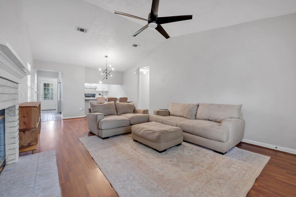 Move-in ready 2-bedroom,2-bath brick home featuring hardwood floors,vaulted ceilings,and a cozy wood-burning fireplace. Bright kitchen with white cabinetry and stainless appliances. Washer and dryer included. Covered back porch overlooks a fenced backyard with peaceful lake views. Rent: $1,500/month,Security Deposit: $1,500,Pet Fee: $250 non-refundable,Available: Immediately. Tenant responsible for utilities. Application and screening required. Lawn and Pest Control Included. Furniture not included.