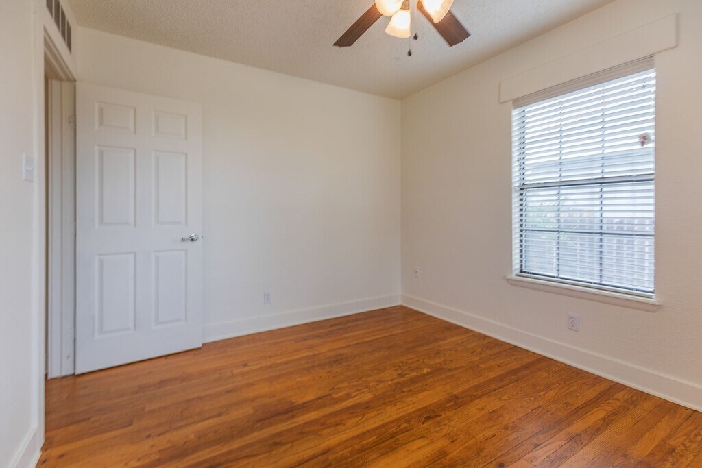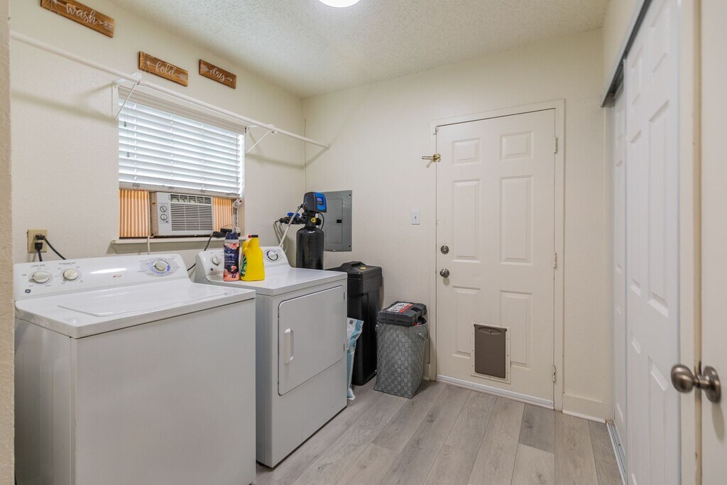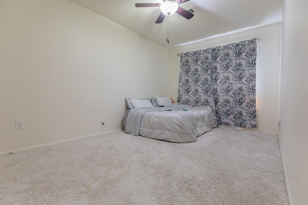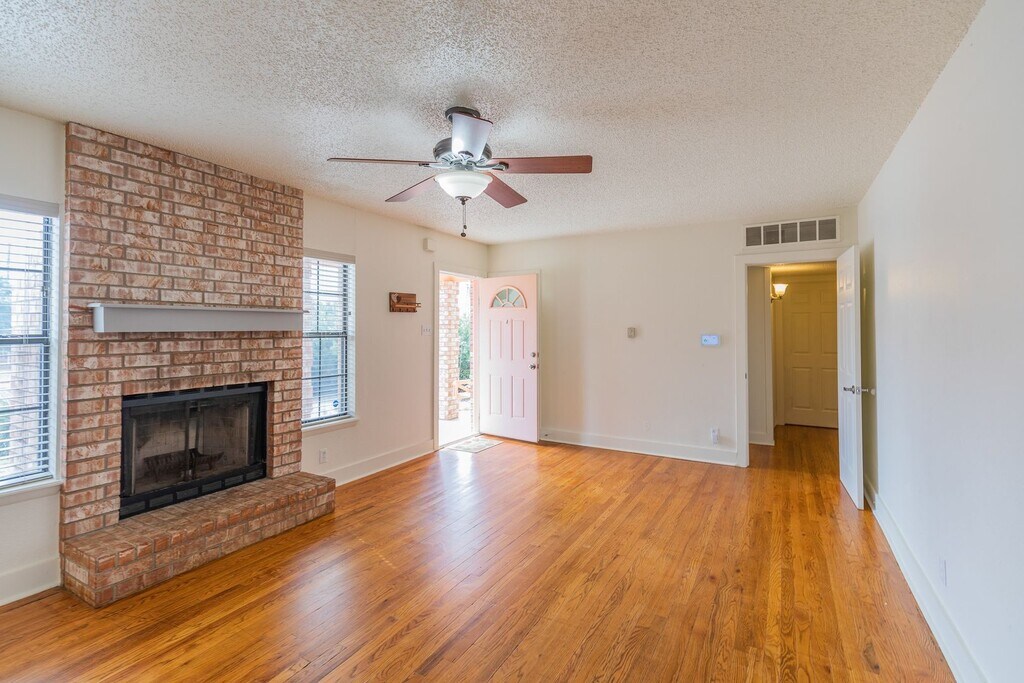 3 bedroom 2 bath, the living room has wood floors and woodburning brick fireplace. 2 guest bedrooms to the left with full guest bath. Each guest room has wood floors, ceiling fans, and step-in closets.Right side off living room enters into dining area with wood laminate floors, solid surface kitchen countertops, breakfast bar, recessed doublesink, newer fixtures, Off dining, is master bedroom with walk-in closet and en-suite 3/4 bath. Off kitchen, is the utility room with washer/dryer and pantry that leads to back yard. Concrete porch with grassy area transitioning into xeriscape.
