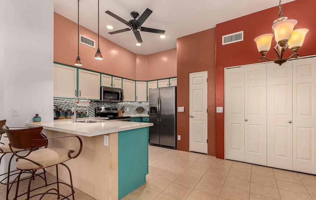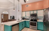 Community Landscaping, Exterior Stucco & Paint, Tile roof, and Community Street maintenance. Property comes with all Appliances, Freshly Painted interior, Custom Painted Kitchen, Quartz Kitchen countertop, Tile floor throughout the living areas, Bedroom with 2 Walk-in Closets, Bathroom newly Upgraded: Walk-in shower w/Tile surround, New fixtures, New Vanity, New lighting. This unit is located near it's covered parking space as well as a disable parking spot. It's a short distance from the mailbox cluster as well as the community Pool/Spa and Rec center. The Community is located near so many amenities: Restaurants, Shopping, Ann Day Community Park, Dog Park, Medical facilities, Short Distance to Pima Community College NW campus
