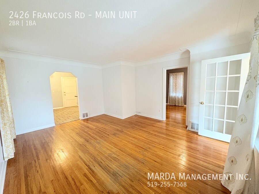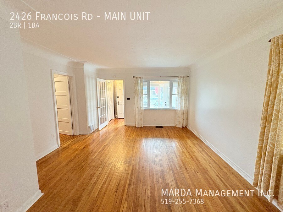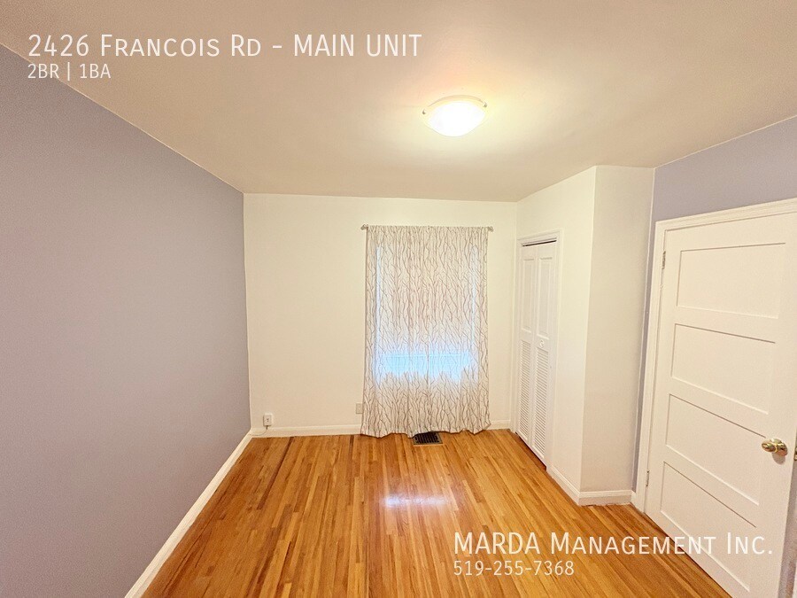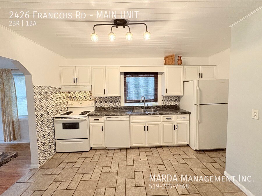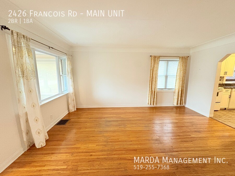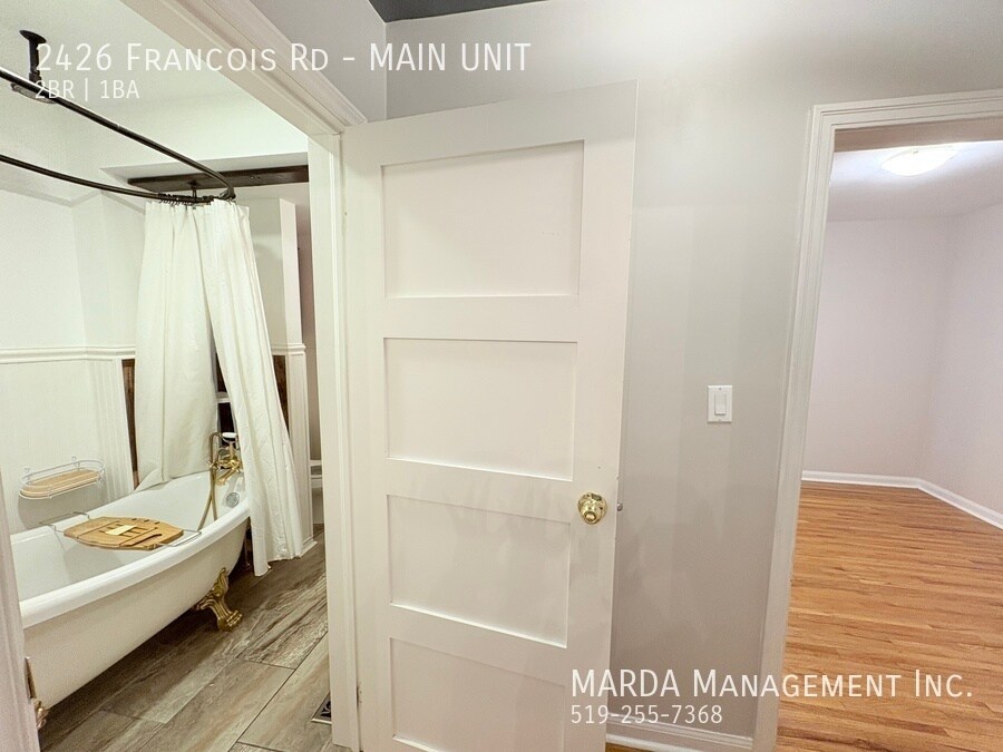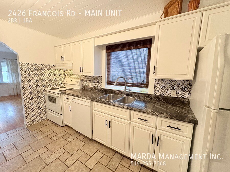 Welcome to 2426 Francois Main, a beautifully maintained 2-bedroom, 1-bath main floor unit located in a charming triplex on Windsors east side. This home blends vintage character with modern comfort in a peaceful, convenient neighbourhood. Step inside the enclosed front porch, perfect for morning coffee or extra storage, leading into a spacious living room that offers warmth and natural light. One of the bedrooms is located just off the living area, providing a cozy and accessible retreat. The kitchen features stunning cabinetry, a stylish backsplash, and a movable island for added space and storage-perfect for cooking and entertaining. Off the kitchen, youll find a beautifully designed bathroom with a classic clawfoot tub, rain shower head, vessel sink, and vanityan elegant mix of antique and chic. The second bedroom offers a unique walk-in closet, ideal for added storage or organization. The unit also includes access to a shared laundry area with a washer and dryer located in the basement for added convenience. Located near bus routes, parks, and shopping, this unit offers both comfort and accessibility. Tenants are responsible for 60% of hydro, gas, and water utilities. First and last months rent and a credit check are required. Professionally managed by MARDA Management, offering 24/7 maintenance support and easy rent payment options. Call MARDA MANAGEMENT today at or email to schedule your viewing! Fenced Back Yard Freshly Painted Front Porch Laminate Flooring No Smoking Allowed Pet Friendly