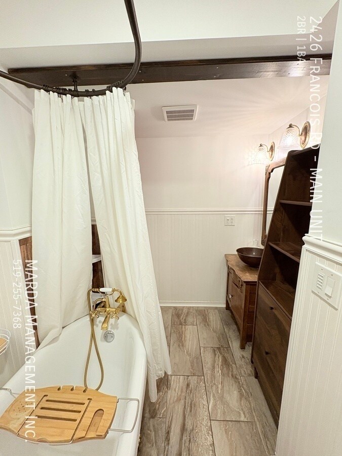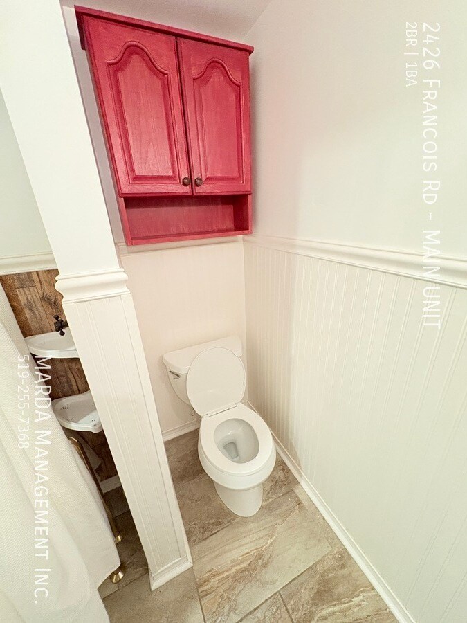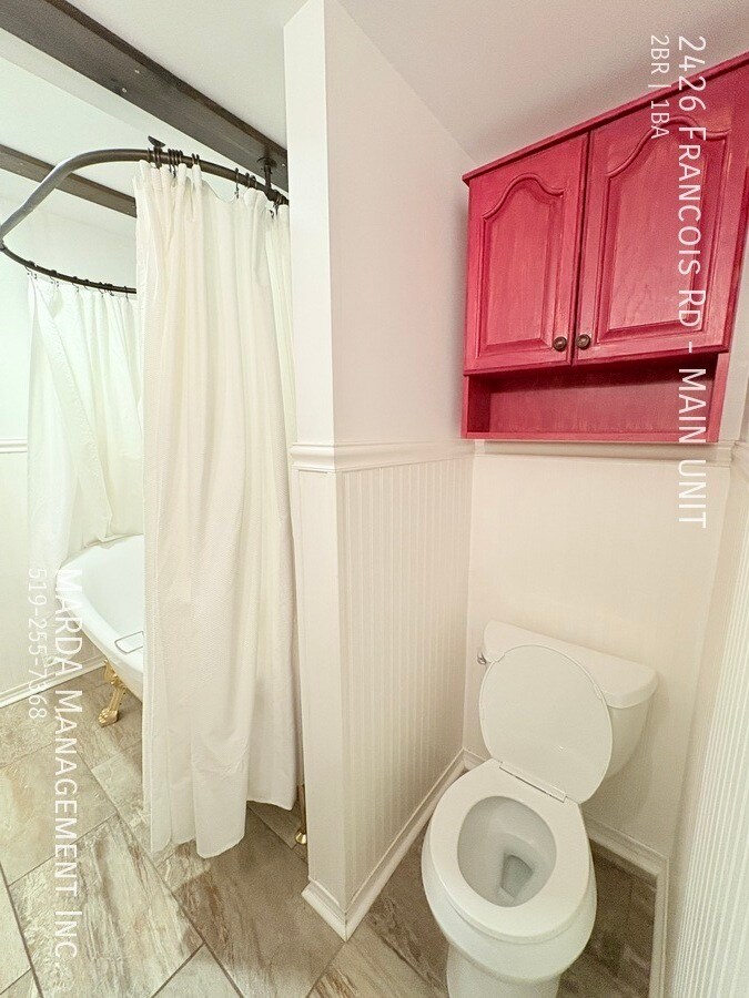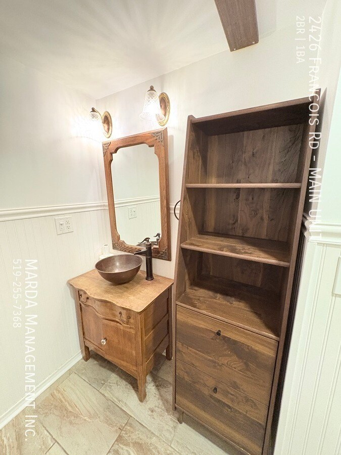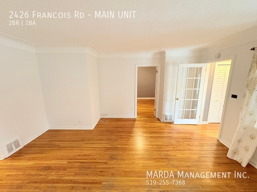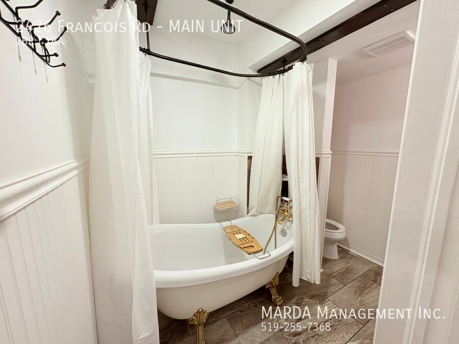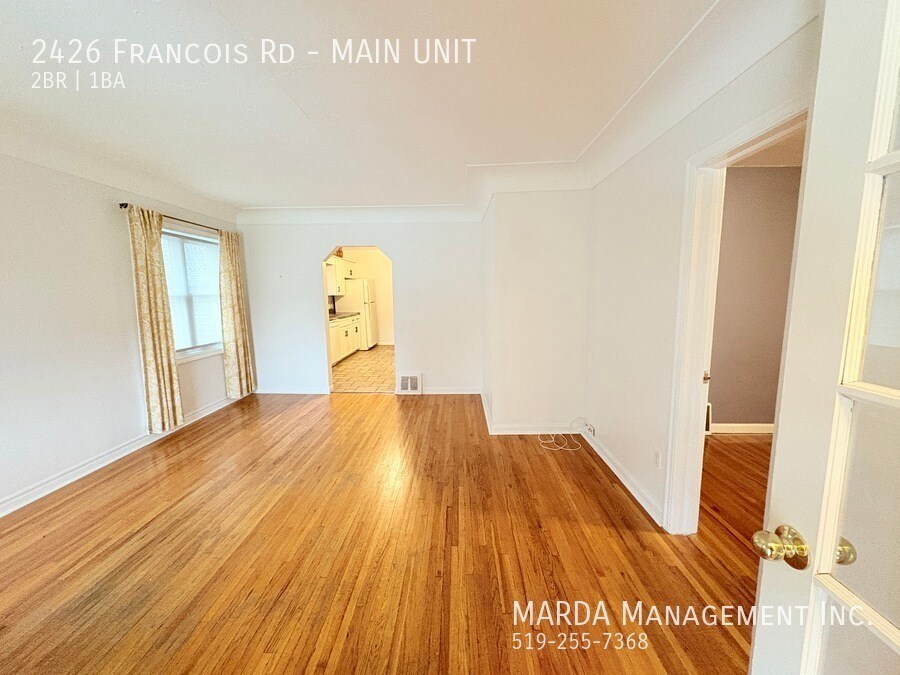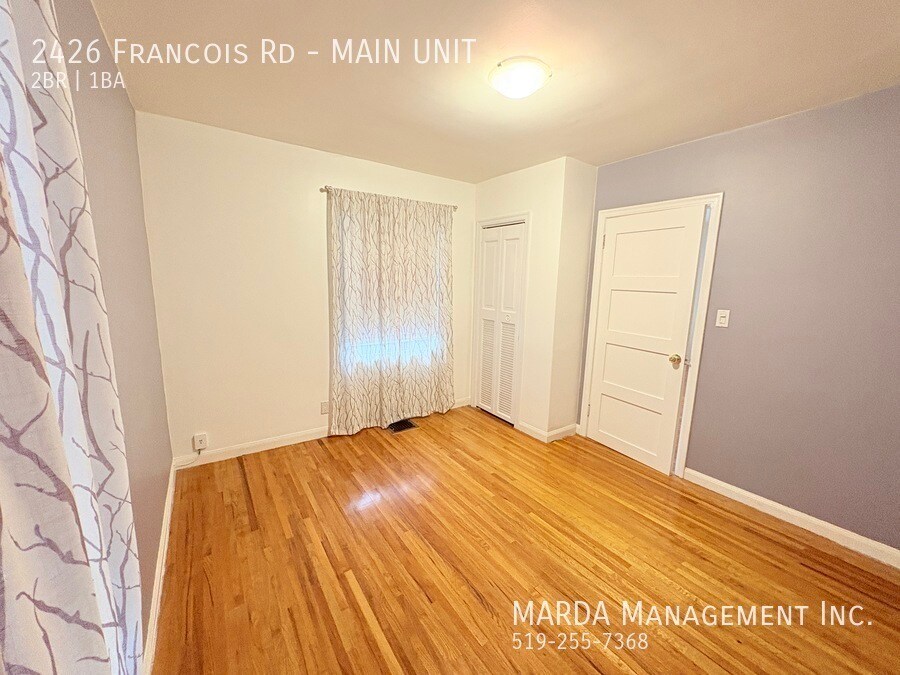 Welcome to 2426 Francois Main, a beautifully maintained 2-bedroom, 1-bath main floor unit located in a charming triplex on Windsors east side. This home blends vintage character with modern comfort in a peaceful, convenient neighbourhood. Step inside the enclosed front porch, perfect for morning coffee or extra storage, leading into a spacious living room that offers warmth and natural light. One of the bedrooms is located just off the living area, providing a cozy and accessible retreat. The kitchen features stunning cabinetry, a stylish backsplash, and a movable island for added space and storage-perfect for cooking and entertaining. Off the kitchen, youll find a beautifully designed bathroom with a classic clawfoot tub, rain shower head, vessel sink, and vanityan elegant mix of antique and chic. The second bedroom offers a unique walk-in closet, ideal for added storage or organization. The unit also includes access to a shared laundry area with a washer and dryer located in the basement for added convenience. Located near bus routes, parks, and shopping, this unit offers both comfort and accessibility. Tenants are responsible for 60% of hydro, gas, and water utilities. First and last months rent and a credit check are required. Professionally managed by MARDA Management, offering 24/7 maintenance support and easy rent payment options. Call MARDA MANAGEMENT today at or email to schedule your viewing! Fenced Back Yard Freshly Painted Front Porch Laminate Flooring No Smoking Allowed Pet Friendly