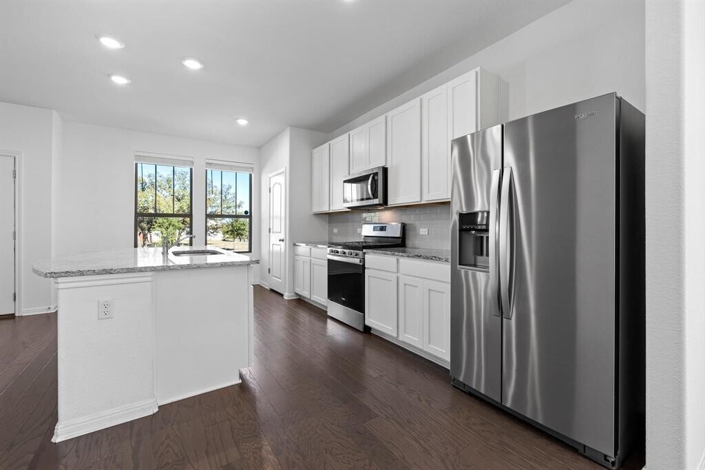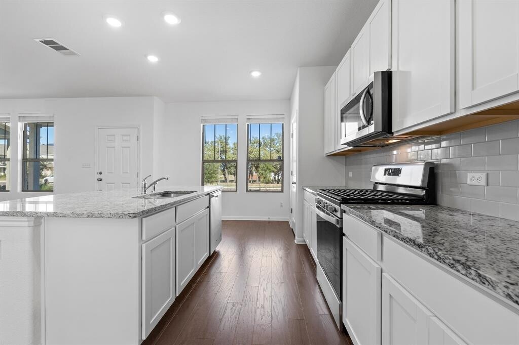 Open and airy floor plan with a gorgeous kitchen and large island. The cozy dining area overlooks the fenced back yard, and the front porch looks out to the park across the street with lovely trees. The two-car attached garage is a great feature. Upstairs you'll find all three bedrooms, a living space and the laundry room complete with a washer and dryer! The cluster mailboxes are across the street. Washer, dryer and refrigerator included. Use to submit apps. Available now.