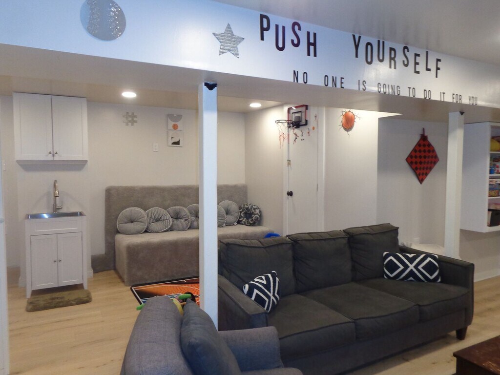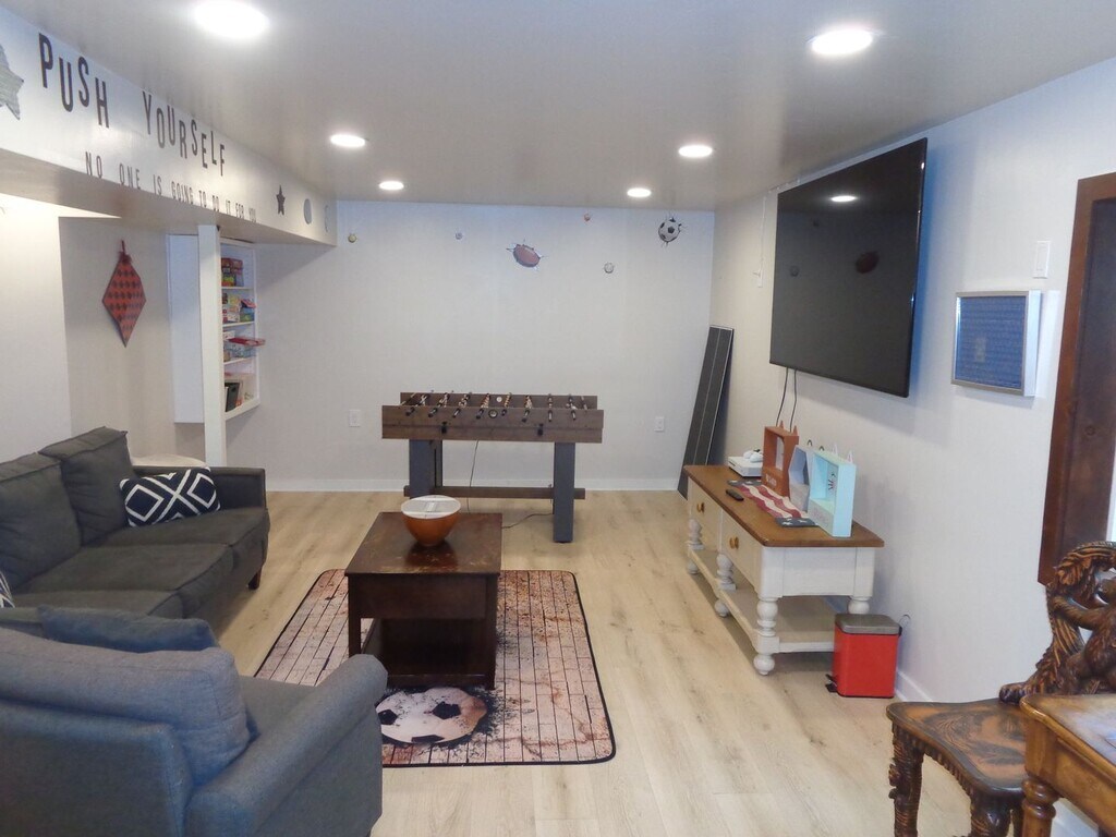 Complete 4 bedroom home fully remodeled and updated. Mix of carpeting and some wood floors. Kitchen has great marble counter space and all appliances with counter seating. Small dining area by kitchen. Main floor bedroom and bath. Living room has gas fireplace and wood beamed ceilings for that mountain feel. The family room is set up for games and entertainment as well as laundry and separate sink. Bedrooms all have closet space and plenty of room for the beds and dressers. Large deck for outdoor entertaining. Parking in front for at least 3 vehicle.s