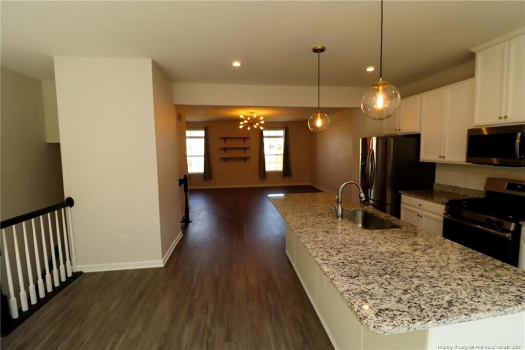 This charming and inviting townhome is nestled in south Raleigh and ready for occupancy! Welcome to 244 Amber Acorn Avenue, conveniently positioned between Raleigh and Fuquay-Varina with easy access to RTP via I-540. The interior is filled with natural light, tall ceilings, and high-end finishes throughout. Enter via your covered front door and you're greeted by a lovely foyer that leads up to the second floor living space. This area is a perfect example of an open concept and is truly stunning. Durable and attractive luxury plank floors fill this area from front to back. The family room occupies the front half and includes custom floating shelving flanked by two picture windows and a custom Sputnik chandelier. The kitchen is a sight to behold with an expansive granite-topped island with double pendant lights, a deep bowl stainless undermount sink as well as an integrated seating area. Behind the island you'll find a double door pantry, striking white cabinetry, recessed perimeter lighting, granite counters, and a subway tile backsplash. A sleek stainless steel appliance package includes a built-in microwave, a French door refrigerator, and a gas oven. An adjacent dining area is perfectly proportioned and enjoys easy access to a massive elevated deck overlooking a lovely open area and a wooded buffer for additional privacy. Don't forget to visit the tucked-away powder room with a pedestal sink. Next, take a quick jaunt upstairs where you'll find all three bedrooms as well as a conveniently-located laundry room (with washer and dryer included for resident's use). The primary bedroom features two picture windows, a sizable walk-in closet, and a luxury bathroom showcasing tiled floors, an elevated satin finish marble-topped vanity with dual sinks and an elegant walk-in shower with glass door and a transom window. Bedrooms #2 and #3 are both surprisingly large and offer ample closet space as well as easy access to a full hall bathroom. Before finishing your tour, be sure to visit the first floor living space - this area is not easily found in townhomes and offers that additional room that we all seem to be in need of these days! It could be put to use as a home office, exercise area, study, rec room, media/game room, etc.; the possibilities are endless. This room also provides direct access to the 2 car garage for added convenience and privacy.