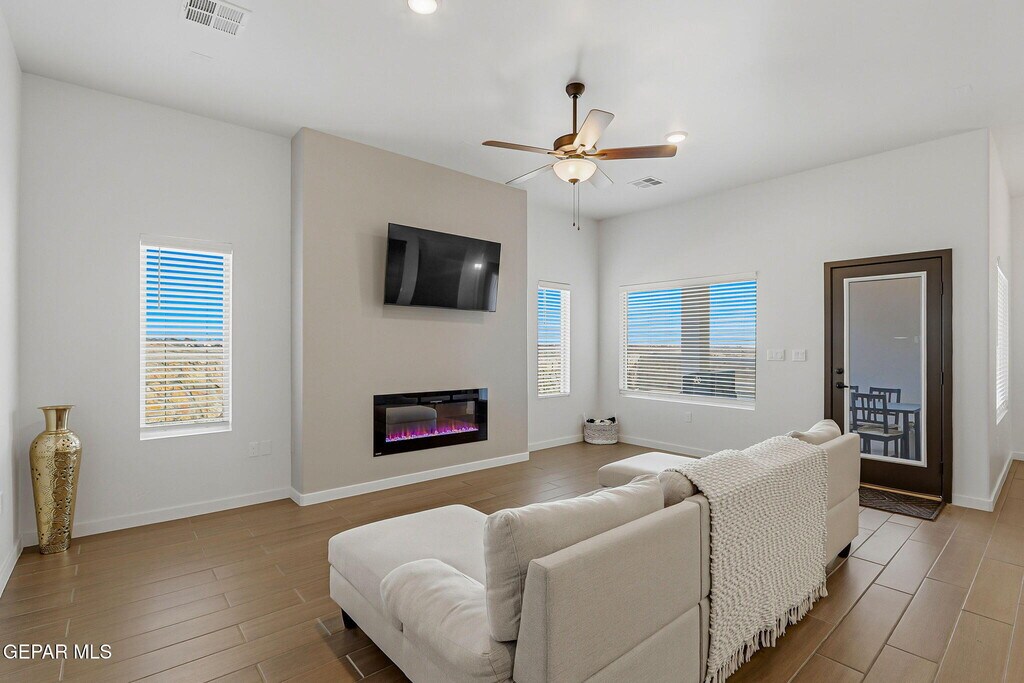 Welcome to this stunning fully furnished 4-bedroom,3-bath luxury home designed with comfort and style. The open-concept living space offers a seamless flow,perfect for both everyday living and entertaining. The kitchen is a true showstopper,featuring elegant quartz countertops,stainless steel appliances,a cooktop with pot filler,LED under-cabinet lighting,and a stylish decorative tile backsplash. The primary suite is spacious and refined,complete with a walk-in closet and a spa-like bathroom showcasing a unique tile design,oversized walk-in shower,standalone soaking tub,and double vanity. A private mini-master suite adds flexibility and convenience for guests or multi-generational living. Additional highlights include ceiling fans in every bedroom,hand-textured walls,plush carpeting in the bedrooms,2-inch faux wood blinds throughout. Enjoy surround sound wiring in the family room,primary suite,a back patio with landscaped backyard and a view. Make your appointment now.