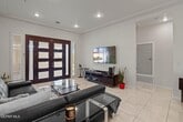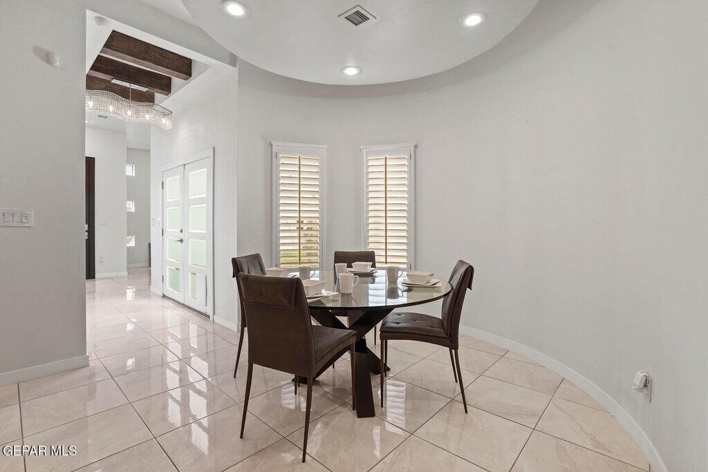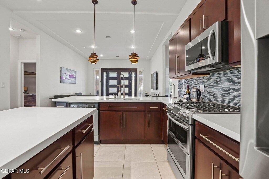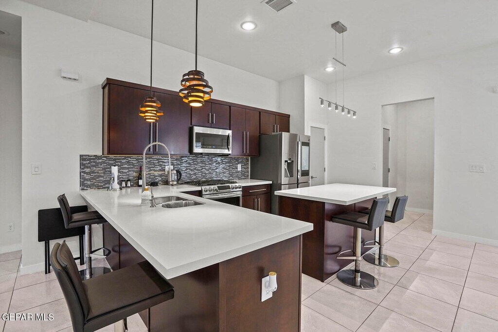Your future home just hit the market! This modern home has it all! Step through the glass-paned door into a welcoming foyer & on into a living space featuring an abundance of shuttered windows,tall ceilings & a great vibe. Gleaming tile floors throughout are complemented by wood beam trims high up & exceptional lighting fixtures all through the home. The kitchen offers handsome dark cabinetry,quartz counter tops,& custom tile backsplashes as well as a breakfast bar AND a sit-down center island,all highlighted by special pendant fixtures. A dining area nestles in a unique curved bay nearby. 3 bedrooms,and office,& 2.5 baths include a stylish master suite boasting a quartz-topped bathroom vanity and walk in closet. There's a relaxing front patio centrally located in the heart of home. Another covered patio is located in the backyard complimented by an outdoor kitchen and outdoor 1/2 bath! So many other special touches to mention!
