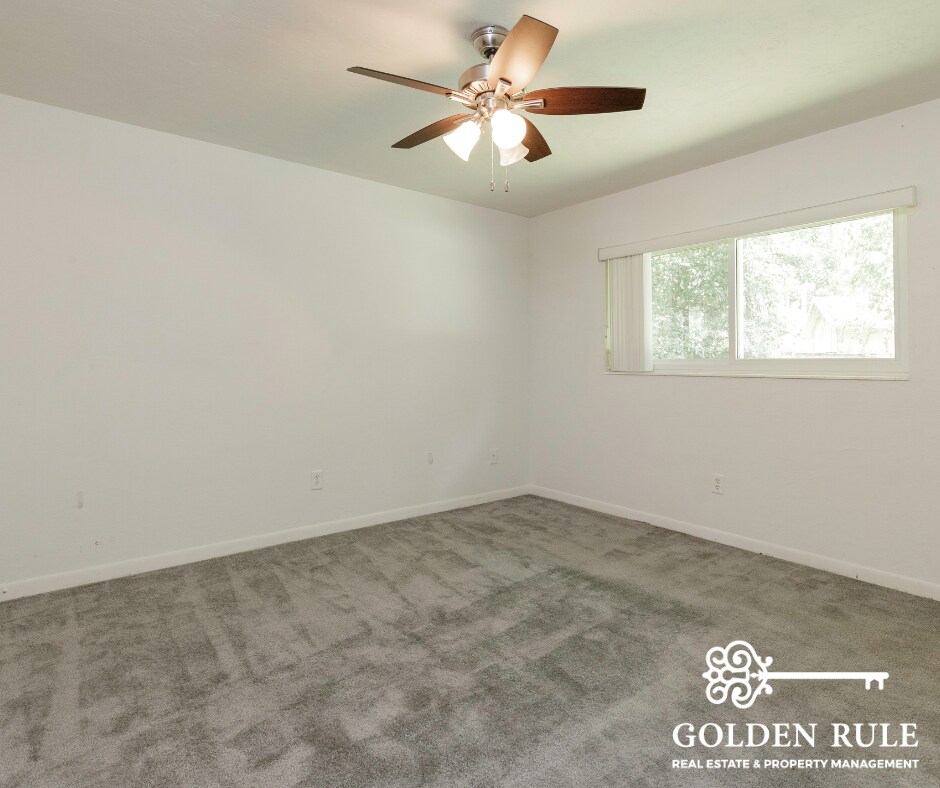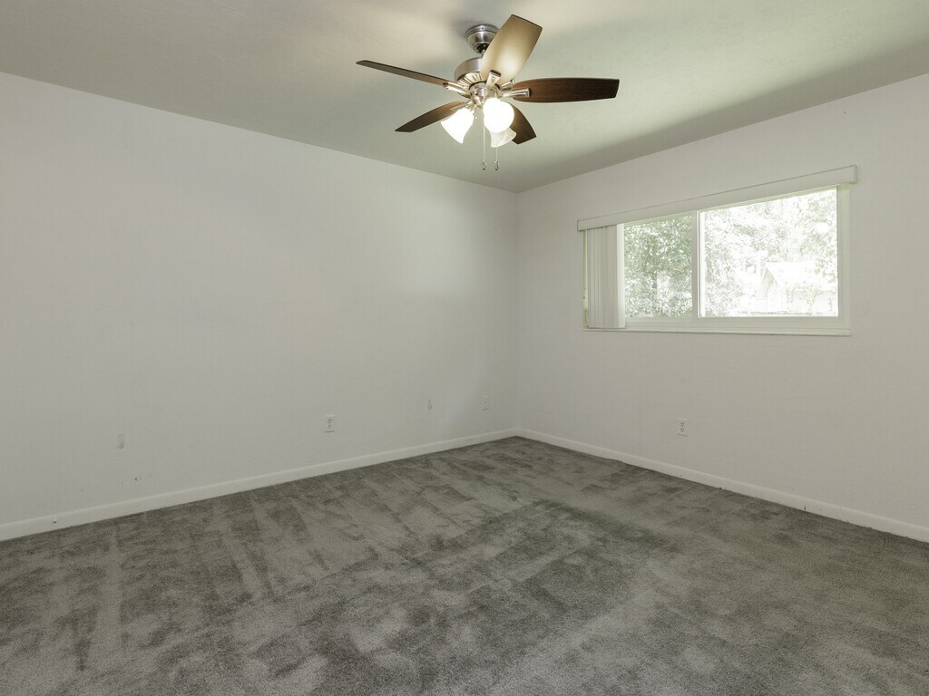 A charming single-story ranch nestled among mature trees in a peaceful Gainesville neighborhood. This spacious home features a warm and inviting living room anchored by a classic brick wood-burning fireplace with built-in bookshelves, plus sliding glass doors that open to a lush backyard — perfect for relaxing or entertaining. The galley-style kitchen offers ample cabinet storage, a full appliance package including range, refrigerator, dishwasher, and microwave, and plenty of counter space. Multiple bedrooms provide comfortable retreats, with ceiling fans, generous closets, and a mix of plush carpeting and easy-care tile flooring throughout. Two full bathrooms round out the interior, including a tiled walk-in shower. A two-car garage, large fenced yard, and verdant surroundings complete this must-see home. Grad students welcome! (pool non functional)