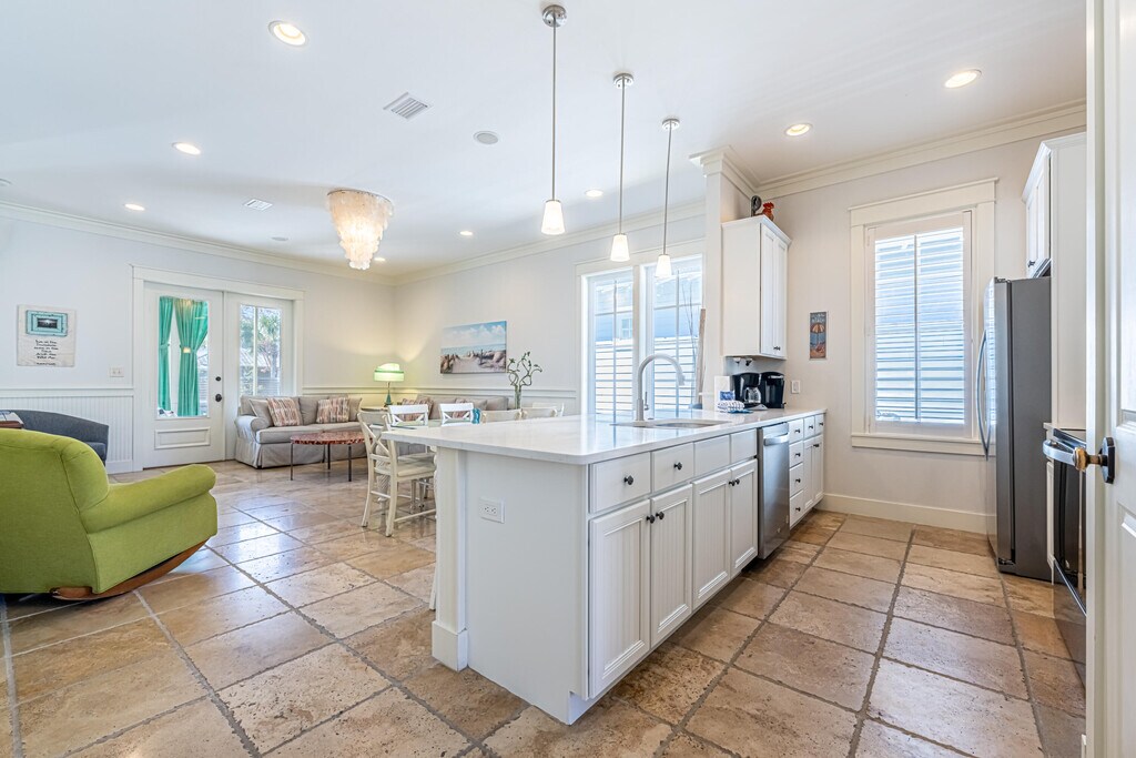 Fully furnished available for winter monthly rental 10/19/2025-4/1/2026. Monthly price varies between $3250/mo to $6100/mo depending on month. Contact for details. Rig's Beach Retreat offers two floors of comfort with 4 bedrooms, 2 living areas, and a 6-seat golf cart in the SANDESTIN GOLF AND BEACH RESORT(r). The open main level features a full kitchen, dining area, and living room, plus multiple outdoor spaces--front porch, screened back porch with seating and sun curtains, and a paver patio with grill. The first floor hosts a master suite and bunk room, while upstairs offers a second master, guest room, and bonus living area with sleeper sofa. With 4 full baths and room for families and friends, this home is the perfect winter retreat and resort living.