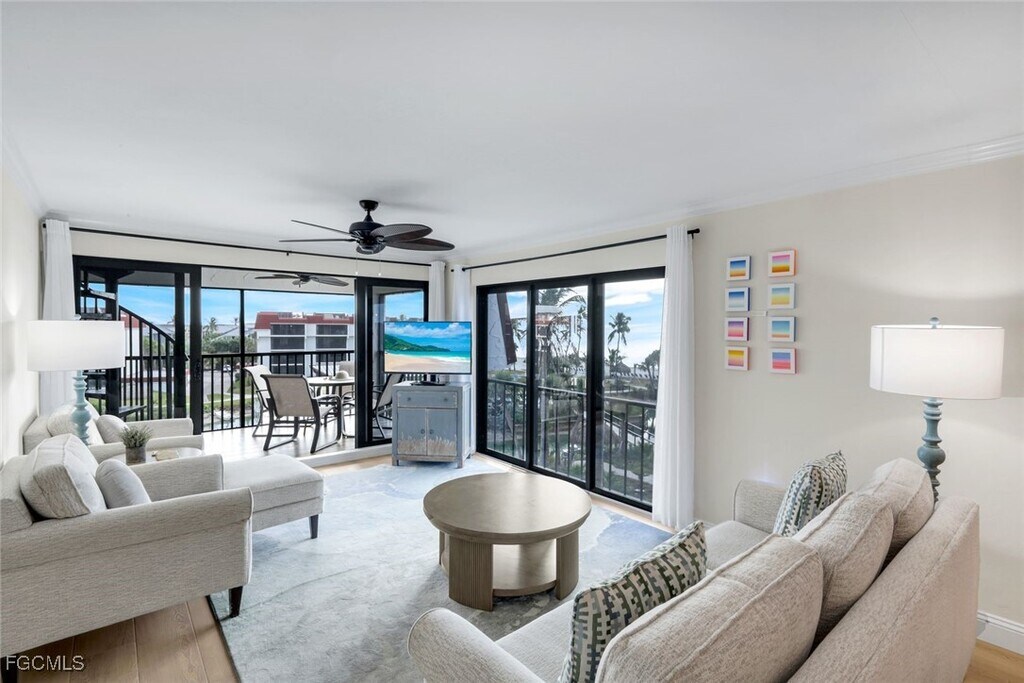 Welcome to Pointe Santo Unit B47,a beautifully renovated corner residence offering exceptional Gulf-front living on Sanibel Island. This end unit enjoys expansive Gulf views and is one of the few Pointe Santo condos with private rooftop access to a large sitting area featuring 360-degree views of the Gulf of Mexico and the island. The spacious screened lanai overlooks the tranquil lagoon with the Gulf beyond,providing a peaceful setting for morning coffee or evening sunsets. Additional windows,unique to this corner unit,fill the living and kitchen areas with natural light and enhanced Gulf views. Completely remodeled for the 2025 rental season,the interior features an open floor plan with updated finishes throughout. The modern kitchen includes new appliances and ample storage. The primary suite offers a king bed,en-suite bath,and lanai access,while the guest bedroom is comfortably appointed for family or guests. Additional conveniences include in-unit laundry,high-speed Wi-Fi,and beach essentials. Pointe Santo is a Gulf-front community offering beach access,heated pool and hot tub,tennis and pickleball courts,clubhouse,and lush tropical grounds with a central lagoon. Weekly rentals are permitted with a 7-day minimum. No association rental application fee. A rare opportunity to enjoy one of Pointe Santo’s most distinctive residences.