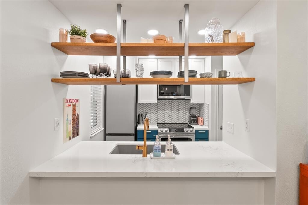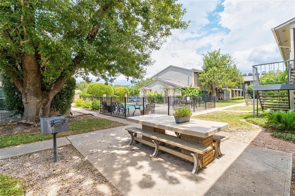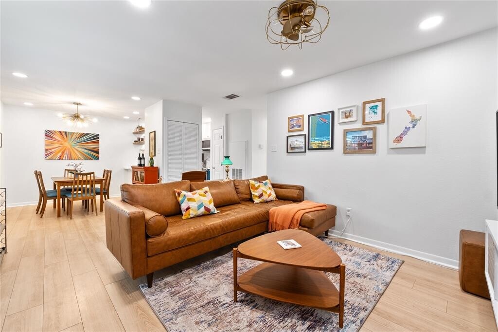 Modern & Stylish North Austin Condo – All Utilities Included and no shared walls. Beautifully updated condo boasts new windows & wooden blinds, recessed lighting, and a stacked washer & dryer. The bright, open living area flows seamlessly into the spacious dining room, highlighted by a mid-century modern sputnik accent chandelier. The kitchen connects to the dining space with attractive open shelving above a deep single basin sink, creating both function and style. Both bedrooms are generously sized to fit a bed, nightstands, and additional furnishings, each with its own closet. The bathroom makes a statement with designer teal herringbone tile and striking gold fixtures. Step outside to enjoy a private community green space or take a dip in the sparkling pool just steps from your door. All utilities are included—even Spectrum 600 Mbps high-speed internet—so you can move right in without extra monthly hassles. Neighborhood perks: Walk to Alamo Drafthouse Cinema, Epoch Coffee, Hopdoddy, Bartlett’s, and more. Pet owners will appreciate the small fenced dog play area at the Subaru dealership next door. This condo is the perfect blend of modern upgrades, stylish design, and all-inclusive convenience in a vibrant, walkable neighborhood.