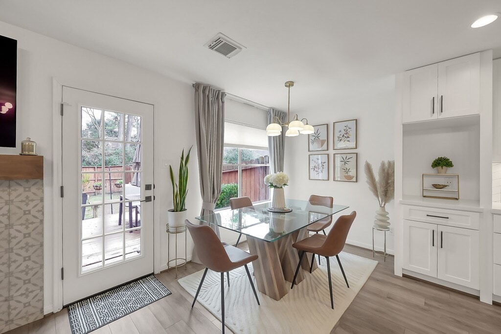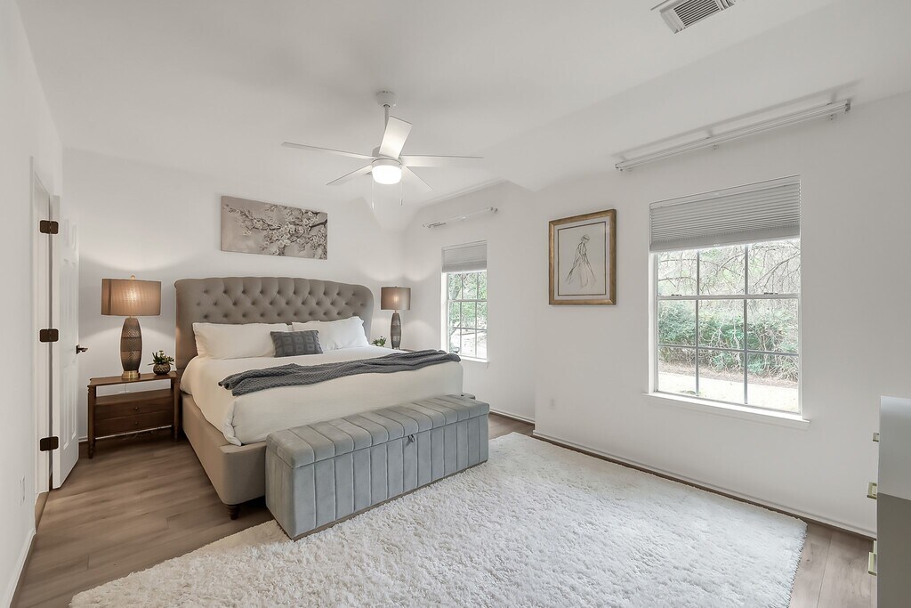 Charming FULLY FURNISHED townhome on greenbelt lot in heart of The Woodlands. LAWN MAINTENANCE & CLEANING 1x/mo INCLUDED! Beautifully updated 3-bed,2.5-bath home is bright and airy throughout. Entry opens to welcoming second-story foyer,leading into open-concept living space. Spacious living room showcases gas-log fireplace with tile surround and mantel,flowing seamlessly into island kitchen with breakfast bar,5-burner stainless gas range and quartz countertops,all open to the dining area. Convenient half bath located downstairs. Upstairs,large primary suite offers an en-suite bath with double sinks,soaking tub,frameless walk-in shower,and large closet. Two secondary bedrooms share full bath,with the utility room conveniently located upstairs. Enjoy peaceful forest views and added privacy from the expansive back deck. Attached 2-car garage includes built-in shelving and cabinets. Ideally located near shopping,dining and entertainment. Zoned to excellent Conroe ISD schools. MLS# 13190132