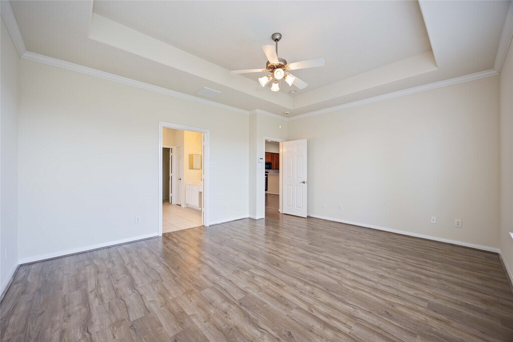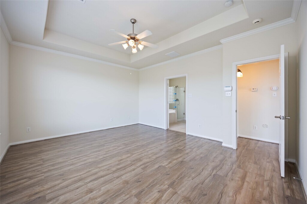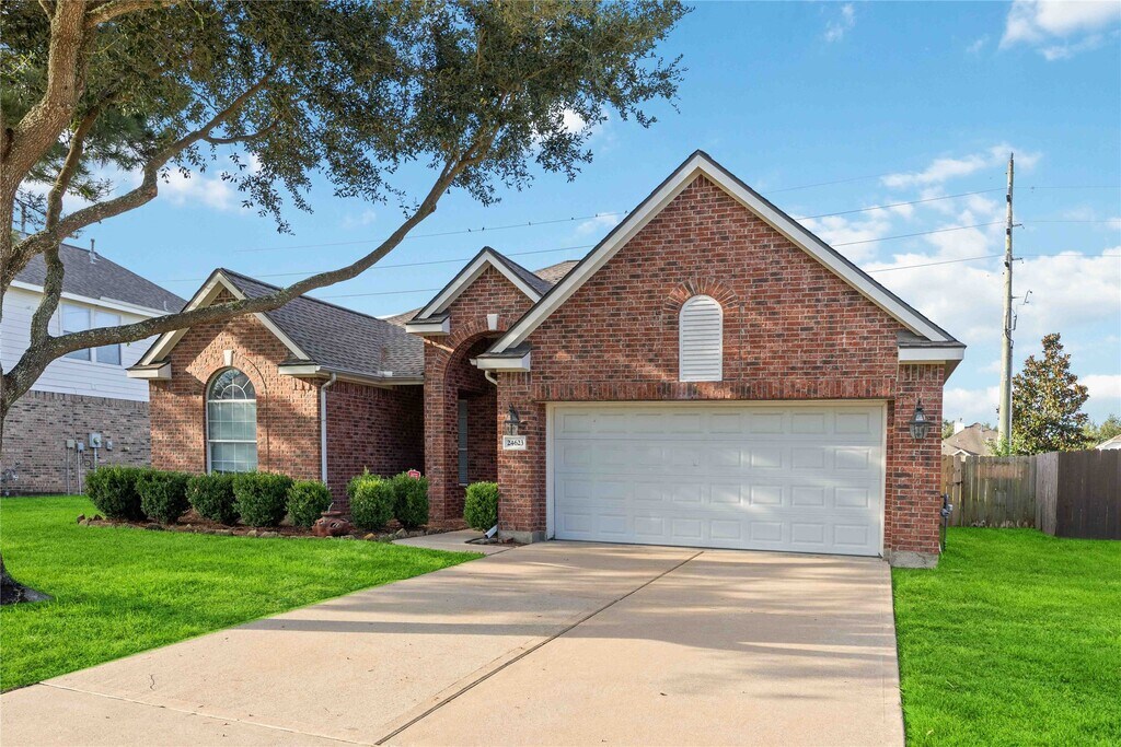 Beautifully spacious single-story 3-bedroom home located in the desirable Lakecrest community,offering convenient access to Grand Parkway (99) and I-10. The home features a split floor plan with an open-concept living area,high ceilings,and elegant touches including crown molding,bullnose corners,42" cabinets,and ash wood laminate flooring throughout—no carpet. The primary suite includes an en-suite bath with a garden tub,separate shower,and an oversized walk-in closet. Enjoy a fenced backyard with a covered patio and no rear neighbors,plus an in-house utility room and attached 2-car garage. Refrigerator is included (not pictured),along with a sprinkler system and water softener for added convenience. MLS# 19197077