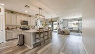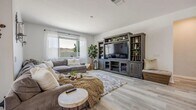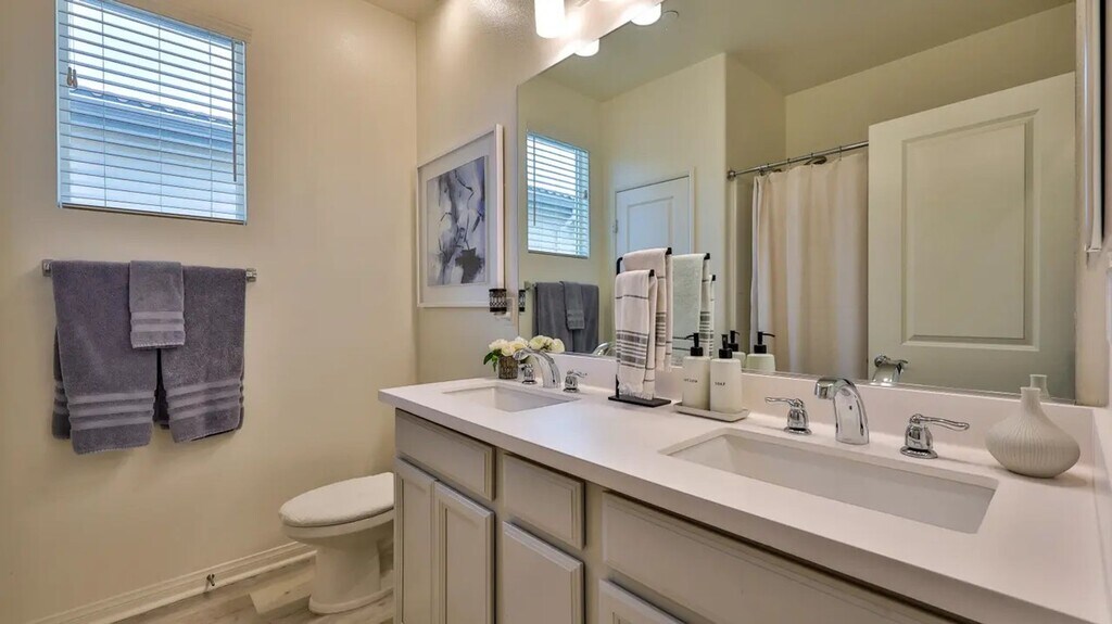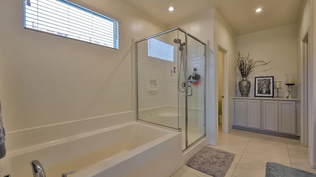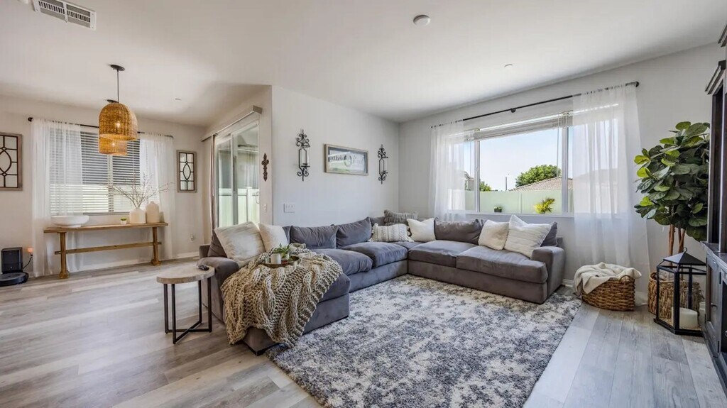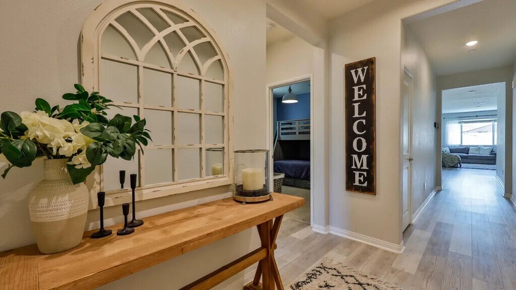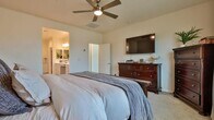 Welcome to this stunning 3-bedroom, 2¼-bath single-story home nestled in a quiet cul-de-sac within the desirable Audie Murphy community. Step inside through a wide entryway that opens to a bright and airy interior featuring light-toned vinyl plank flooring and neutral wall colors throughout. At the front of the home, you’ll find two spacious bedrooms and a full bath, along with a convenient guest ¼ bath. The private primary suite is located on the opposite side of the home and offers a luxurious, spa-like bathroom with a walk-in shower, deep soaking tub, dual-sink vanity with quartz counters, and soft gray cabinetry. The open-concept kitchen is perfect for multiple chefs, featuring a large center island ideal for casual dining, abundant cabinetry for storage, and a refrigerator included for your convenience. Stylish lighting and a 9-foot sliding glass door fill the living space with natural light, creating an inviting atmosphere for entertaining or relaxing. The low-maintenance backyard is designed for outdoor enjoyment and features upgraded concrete throughout, including both side yards—perfect for gatherings and easy upkeep. Additional highlights include: Solar system & Tesla back up battery, tank less water heater, refrigerator, washer & dryer, two car garage and Vivant security system already installed on property. Enjoy resort-style living with community amenities such as scenic walking and biking trails, swimming pools, sports courts, playgrounds, a lending library, and frequent social events at the clubhouse. Conveniently located near top-rated schools and surrounded by a growing neighborhood, this home offers the perfect blend of comfort, style, and community living. All utilities are tenant’s financial responsibility. Solar $206.12 PM Small dog Ok (additional pet rent $50.00 PM) Sorry, no cats