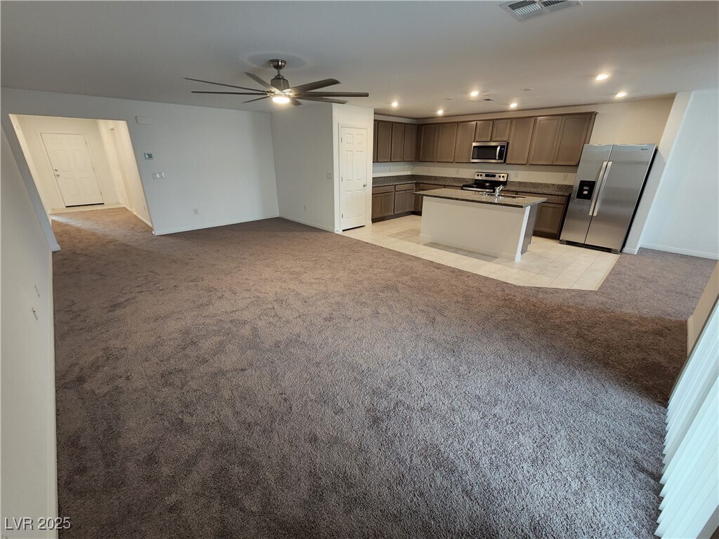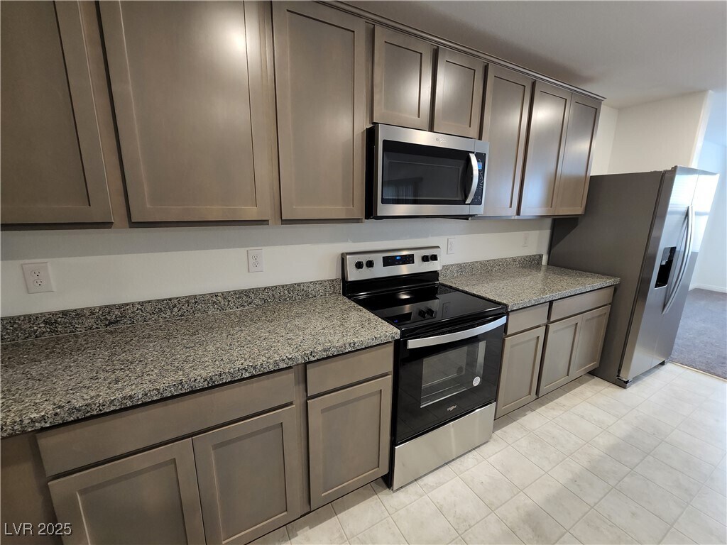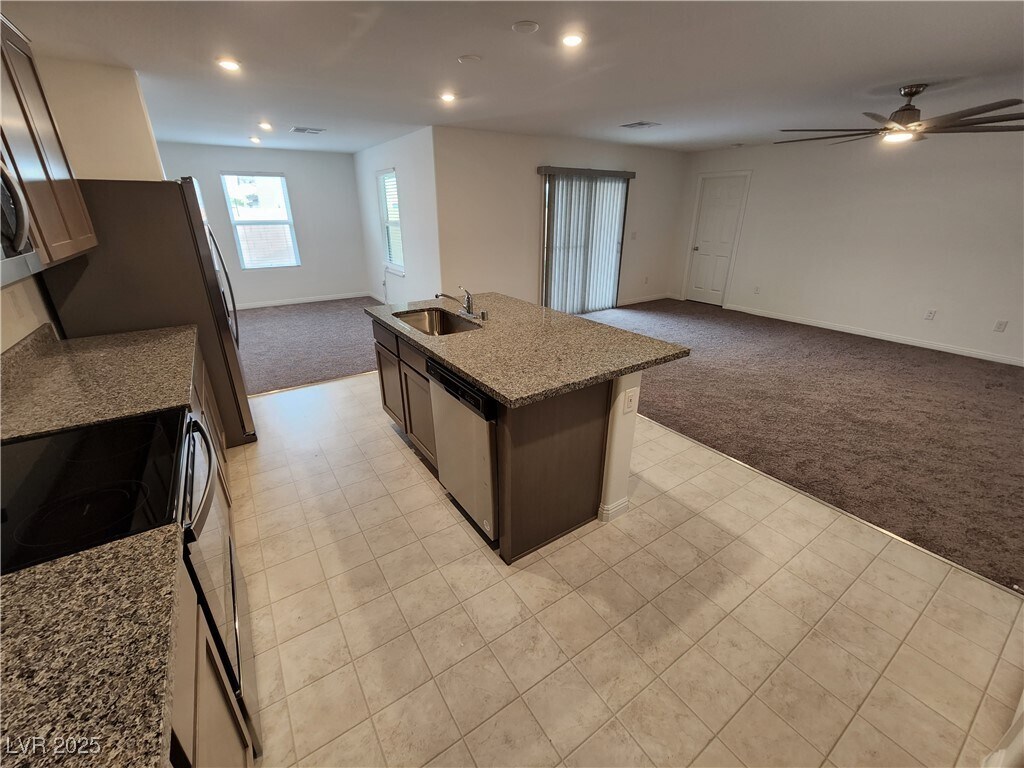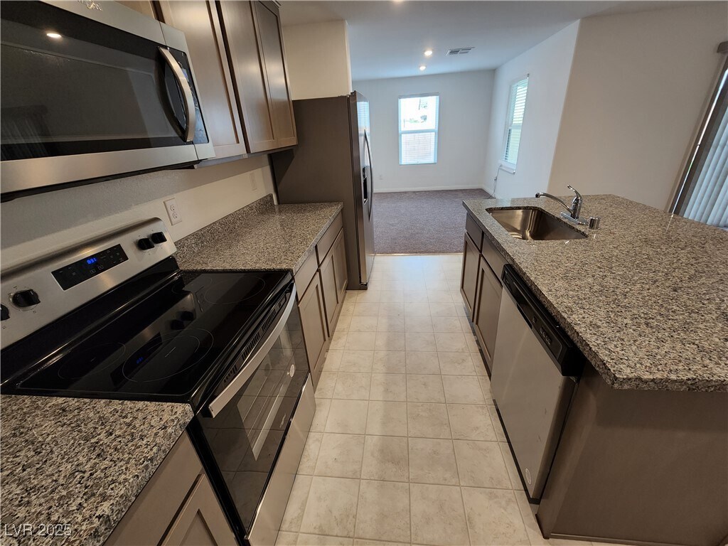 This great 4 bed /3 bath home features a spacious lot with low maintenance landscaping, Appliances are included. Has vinyl flooring in hall/bath/kitchen/laundry and plush carpeting in bedrooms/living room. Kitchen features stainless steel appliances, granite countertops, and an island perfect for entertaining. Backyard included artificial grass, pavers, fruit trees, and COVERED PATIO! Nestled in a beautiful community with dog park, trails, and community park with covered patio, BBQ, and artificial.