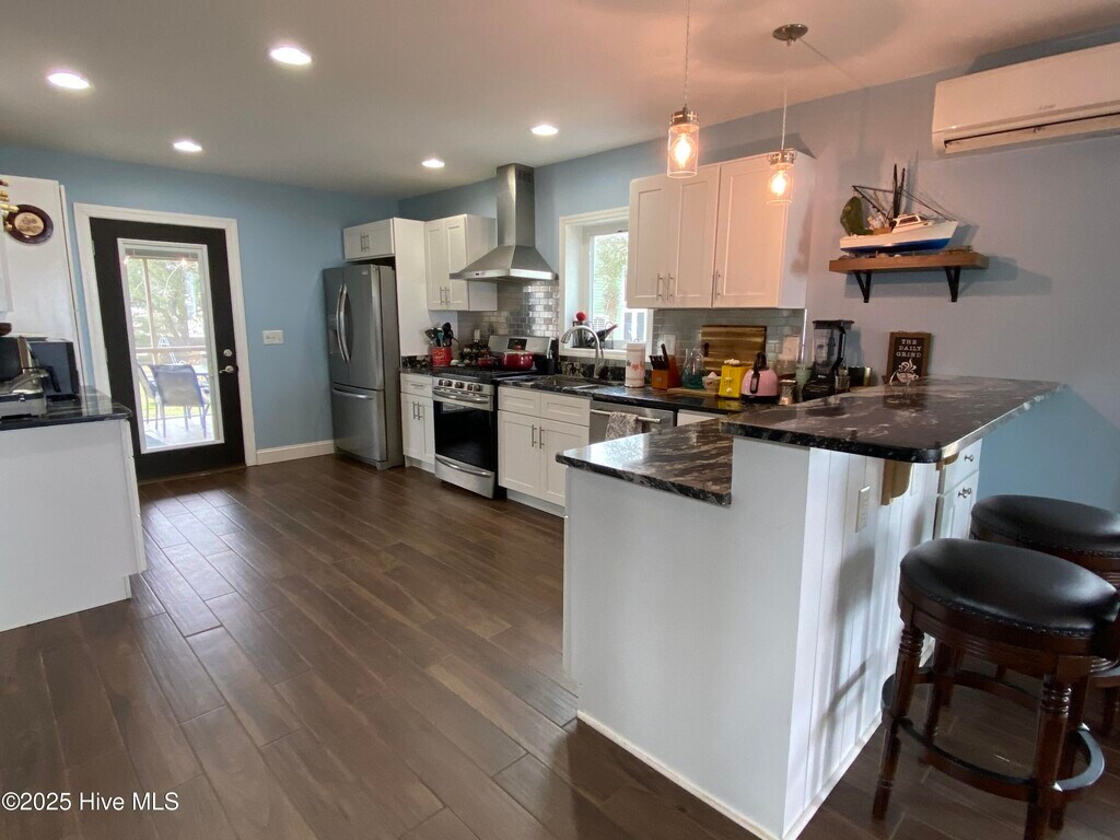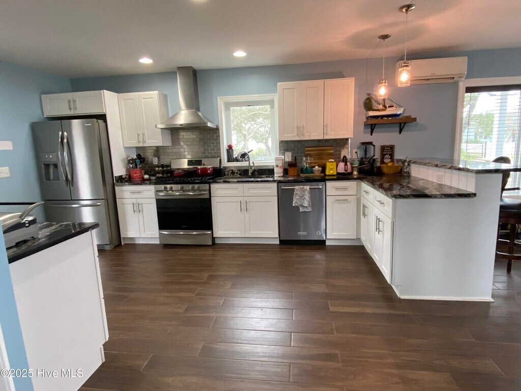 Spectacular fully furnished home in quaint Salter Path. 3 bedroom. 2.5 bath. Gorgeous, custom interior w/open living space on primary ground level. Beautiful granite & stainless kitchen. Outdoor living space includes large screened porch. Large master king suite has private deck overlooking Bogue Sound, office nook, walk-in shower w/dual rain showerheads & separate soaking tub. Second bedroom is queen. Third bedroom is full. Detached one-car garage includes gym equipment. Primary level includes two (2) highly efficient ductless heating/air system. Gas stove and on-demand water heater. One (1) small pet may be negotiated with pet fee, deposit & rent. Rent includes all utilities (electric w/cap, water w/cap, trash/recycle, Internet). Cable TV NOT included, but property is Roku, Sling, Streaming ready. Minutes to boat ramp & marina (not included). Available October 2nd. 247 Shore Drive, Salter Path, NC 28575. $3,200/month