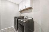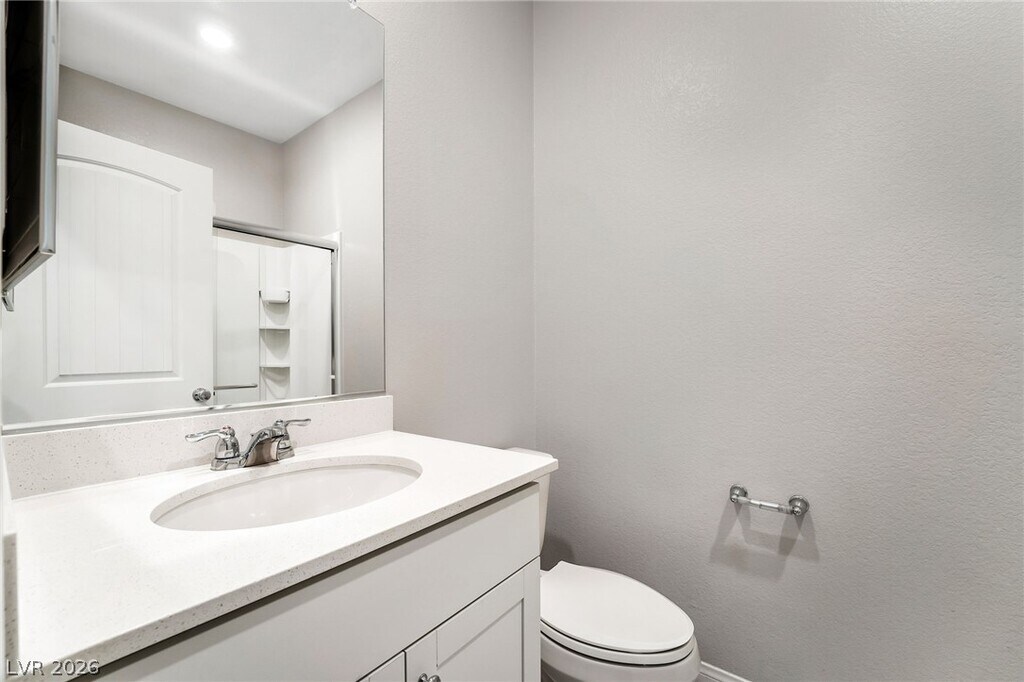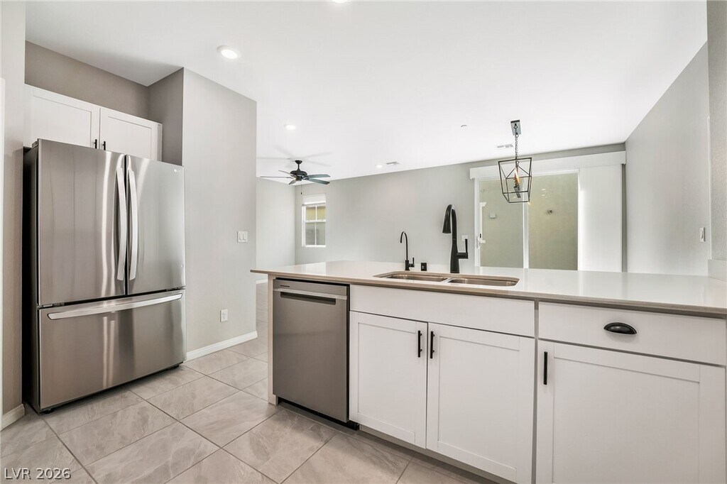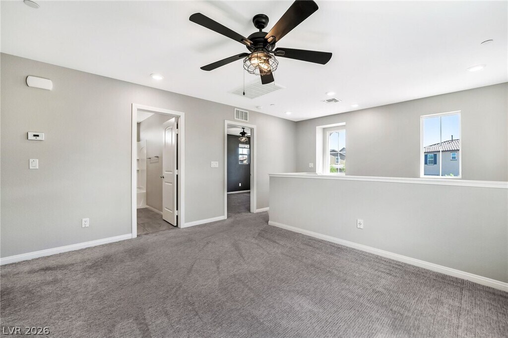 Welcome to this beautifully designed home in the highly sought-after Inspirada community, offering a bright and open layout complemented by sleek tile flooring throughout the main living areas. The inviting living room features a modern electric fireplace set against a stylish accent wall, creating a comfortable and contemporary atmosphere. The kitchen is thoughtfully finished with quartz countertops, stainless steel appliances, a designer backsplash, and a spacious breakfast bar ideal for everyday living and entertaining. A conveniently located downstairs bedroom sits adjacent to a full bathroom, providing added flexibility. Upstairs, a generous loft offers additional living space, while the primary suite includes a walk-in closet and an ensuite bath with dual sinks and a shower-tub combination. Secondary bedrooms are well-sized and versatile, and the home is enhanced with a tankless water heater, water filtration system, and alarm system.