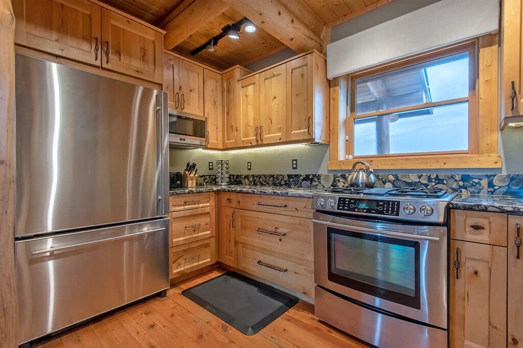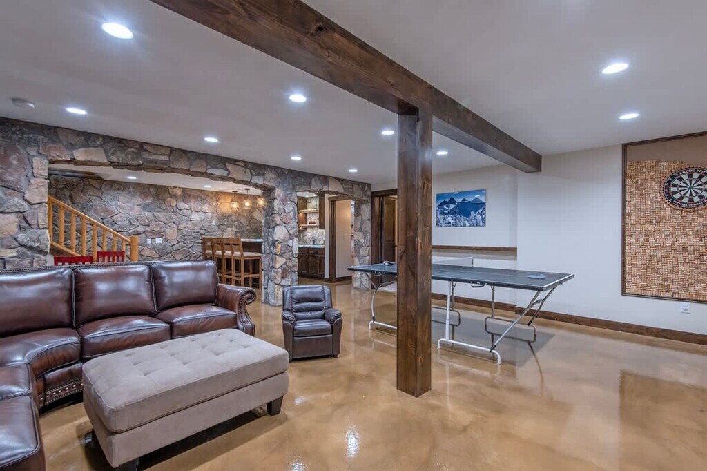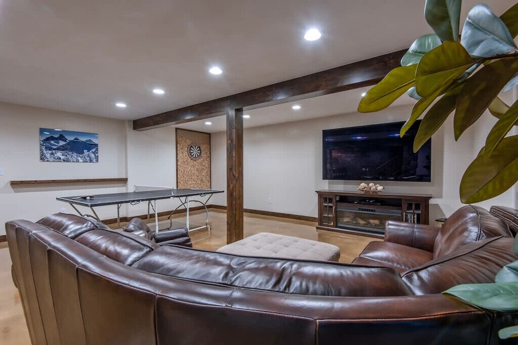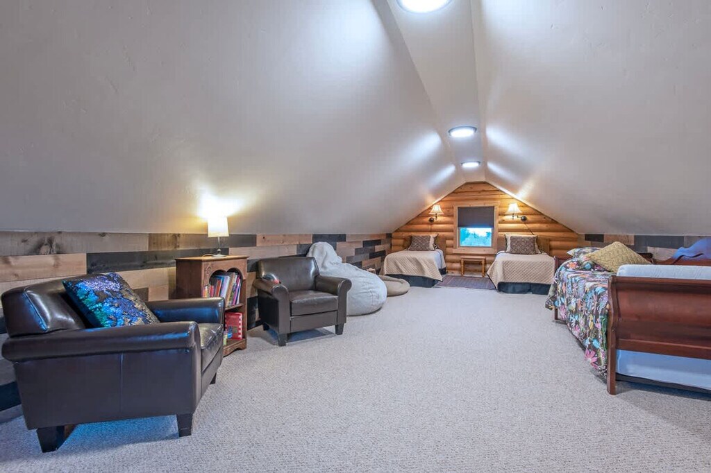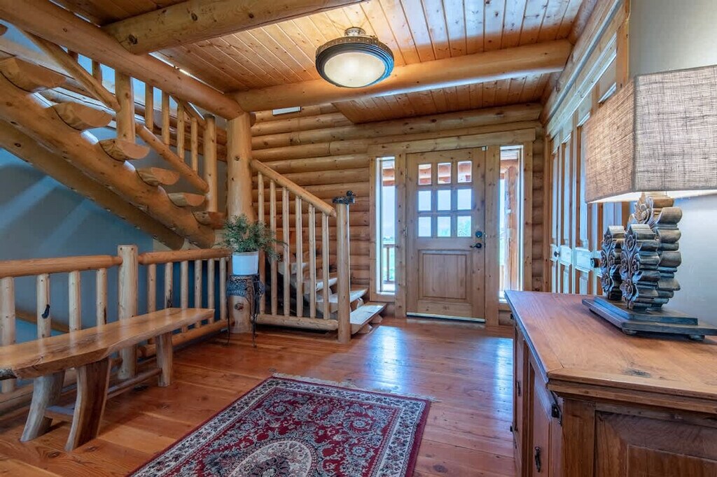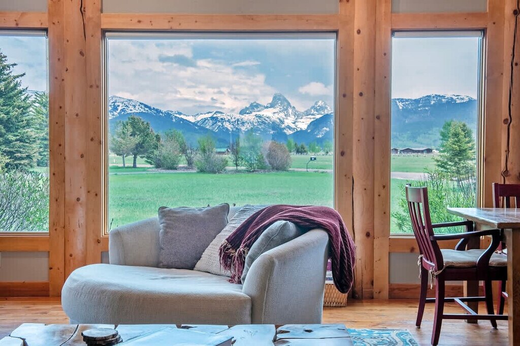 Experience the luxury of Teton Dreams, a stunning log cabin nestled on 3 private acres with breathtaking views of the Grand Tetons. This expansive 4,750 square foot home is located in the sought-after Teton View Corridor, just north of Driggs. Feel at home as you watch the alpenglow from the hot tub, one of the decks, or the leather sectional in the great room. Step inside this beautifully appointed home and be captivated by the Swedish-style log construction and floor-to-ceiling views of the Teton range. The open floor plan is perfect for entertaining, while multiple spaces offer quiet reflection. The main floor features a master bedroom with an ensuite bath, a king-size bed, a stone fireplace, and a private deck with stunning views. The large fully equipped kitchen boasts granite counters and bar seating, complemented by a dining room with Teton views. Upstairs, enjoy additional bedrooms with king and twin beds, a loft area with a pullout couch, and a shared bathroom with a jetted tub. The newly finished basement includes a multi-level bar, a large sectional, and an 83” LG OLED TV, along with three more bedrooms and a modern bathroom. The property allows a maximum of three licensed vehicles in the driveway, with no street parking permitted. Guests can enjoy the hot tub and outdoor dining on the deck, but please note that the master closet and garage are not available for guest use. Located in the tranquil Teton Valley, this home offers easy access to outdoor adventures and nearby attractions. Yellowstone's West Entrance is just over an hour and a half away, while Grand Teton National Park is a little over an hour's drive. Grand Targhee Ski & Summer Resort is a short 19-minute drive, and Jackson Hole Mountain Resort is less than an hour away. The home is also conveniently located near regional airports and charming towns like Driggs and Victor. The cabin is located in an HOA community, and guests are expected to respect the rules and neighbors. Violations of house rules, such as the no events policy, will result in fines up to $2,500 and possible eviction. Quiet hours are from 8:00 PM to 8:00 AM, and smoking or vaping is prohibited inside the home and on the property. The home features fixed exterior security cameras for safety, and guests are encouraged to lock doors when not home. While there is no central air conditioning, the cool mountain evenings and available fans help maintain a comfortable indoor temperature. The home is equipped with high-speed Google mesh Wi-Fi throughout, ensuring seamless connectivity for work or leisure. A workspace with a desk and dual monitors is available in the north bedroom, providing a comfortable environment for remote work. Smart speakers are available in the kitchen, basement, and main living room for added convenience. [SI]
