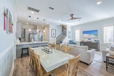 Monthly rental available 12/12/2025-3/7/2026. 3 bedrooms, 3.5 baths, and space for up to 8 guests. Perfect for families or snowbirds, this home features an open-concept living area with modern coastal decor, a fully equipped kitchen with stainless appliances and breakfast bar, and a screened porch for relaxing outdoors. The master suite includes a king bed, walk-in closet, and spa-style bath with double vanity and walk-in shower. Upstairs, two guest rooms provide a queen bed and two full beds, each with private baths. Explore Sandestin with two golf carts included, giving you easy access to beaches, dining, shopping, and resort amenities.