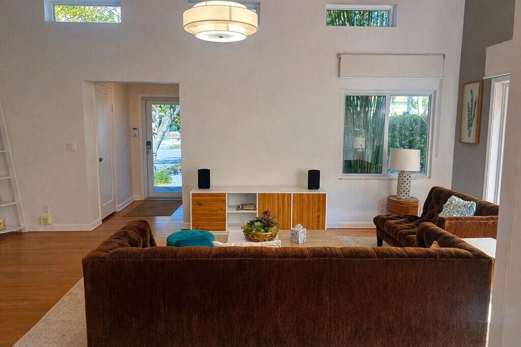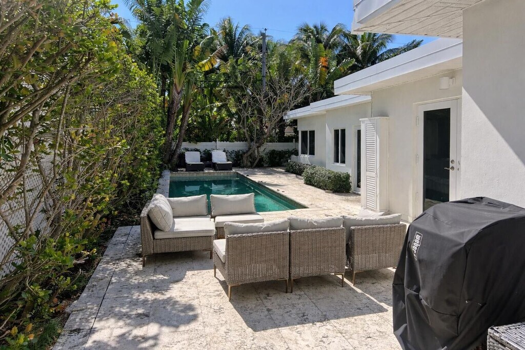 Courtesy of Vikon Realty Available for rent at $10,000/month. Beautifully updated 2-bed, 2-bath mid-century modern home in the highly sought-after SoSo (South of Southern) neighborhood of West Palm Beach. Features include vaulted ceilings with exposed beams, hardwood floors, an updated kitchen with stainless-steel appliances, and abundant natural light throughout. Enjoy a private tropical backyard with a heated saltwater pool, perfect for entertaining or relaxing. Detached carport, central AC, and prime location just minutes from downtown, the Intracoastal, Palm Beach, and PBI. This rental is AVAILABLE FEBRUARY, MARCH, and APRIL 2026!