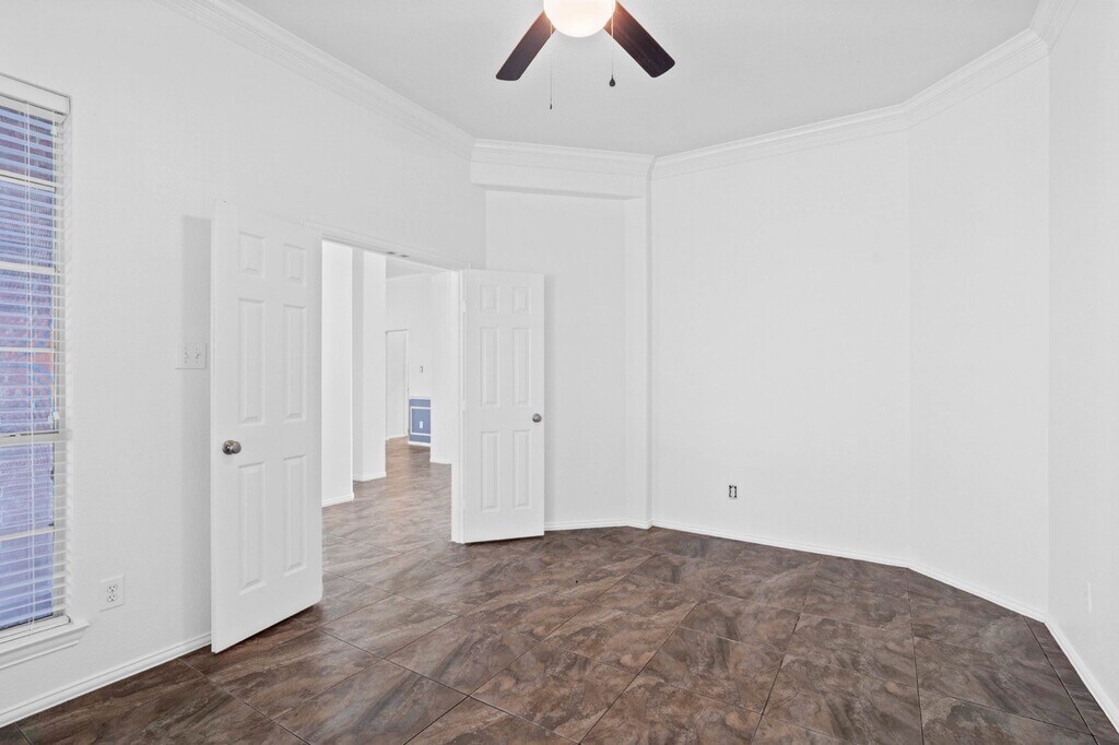 Welcome to this beautifully maintained 3–4 bedroom home with a versatile study,perfectly blending style,comfort,and functionality. From the moment you step through the elegant leaded-glass front door,—plantation shutters,crown molding,and sleek 18" ceramic tile floors FRESH PAINT A chef-inspired kitchen features a massive granite island,stainless-steel undermount sink,stylish tile backsplash,and abundant 42" cabinetry Relax in the private primary suite,complete with his-and-her vanities,a large oval garden tub,separate shower,and glass-block windows that bathe the space in soft light. A study adjacent to the primary suite offers the perfect spot for a home office,nursery,or cozy reading room. Step outside to your expansive covered patio,ideal for backyard barbecues or quiet evenings. With no rear neighbors,you’ll enjoy added privacy. Extras include solar screens to keep things cool,a full sprinkler system,and a garage door opener for convenience. MLS# 51855606