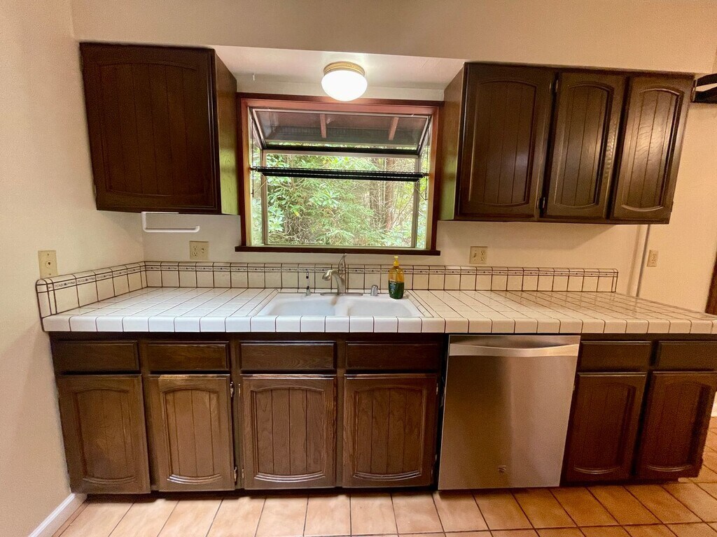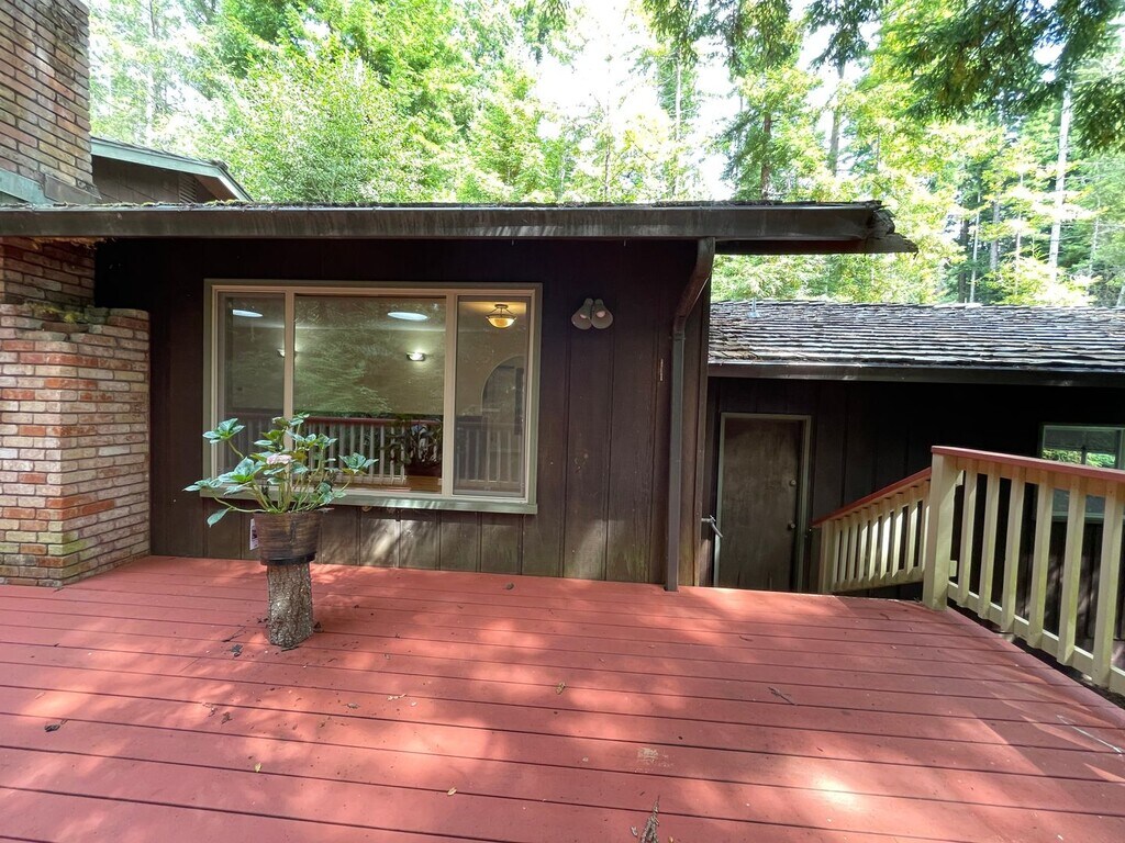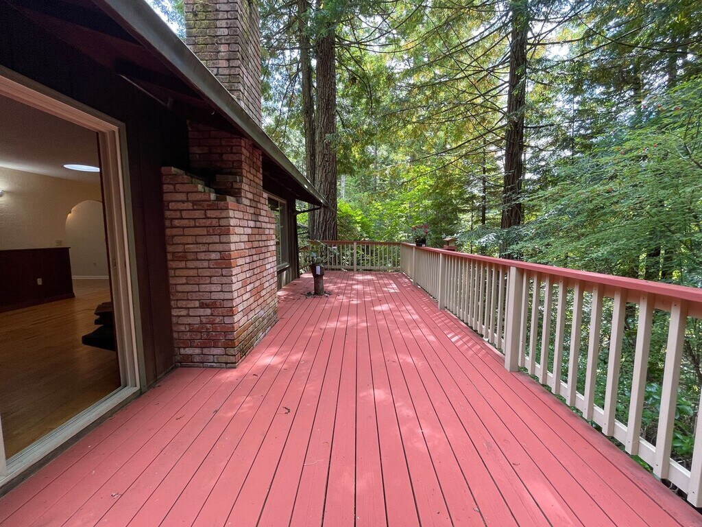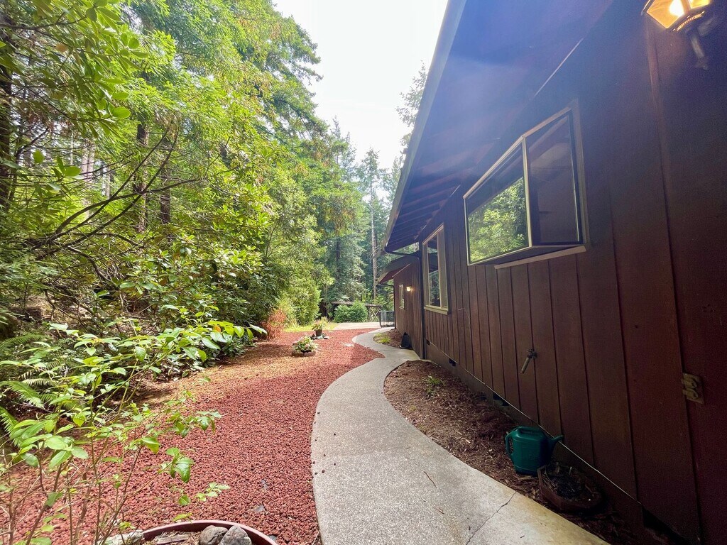 Welcome to a truly idyllic Northern California property. Walk down a manicured, park-like path to the primary entrance of this lovely home. On the main floor, enjoy a large kitchen with a garden window, beautiful wood cabinets, tiled countertops, and updated, high-quality appliances. The home features large skylights, solar tubes, and wood trim throughout. Off the kitchen, the sizable dining area flows seamlessly through an arched transition into the spacious living room, which boasts beautiful wood paneling, a stone fireplace, and built-in shelving. The large 2-car garage, which houses the washer and dryer, is also accessible from the dining area. Access the oversized split-level patio from both the main floor and the downstairs living rooms, and take in the views of the surrounding redwood forest. The upper level hosts 3 bedrooms and a shared full bath. The primary bedroom is a highlight of the home, featuring a beautiful wood-paneled wall, a deep recessed skylight, a private patio, and a sizable full bathroom. The lower level of the home features a second living room with a gas fireplace and patio access, another full bath, and the 4th bedroom. The property sits well off the main road and offers organic landscaping with native flowering plants, park-like pathways, and a magical picnic/BBQ area. For more info and to schedule a showing, please contact Katie via phone or email, and share a bit about yourself. Rent is $3,100/month. Security deposit is $4,700. 12 month lease preferred. Animals considered. Tenant is responsible for PG&E, water and LP gas. Katie Roy BRE 02158090