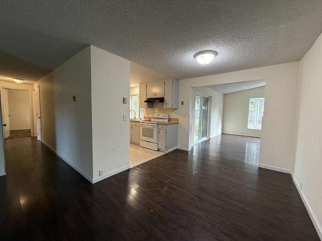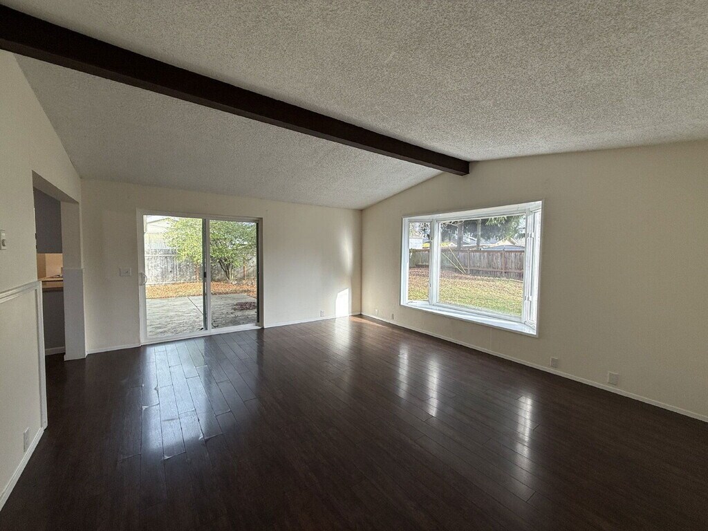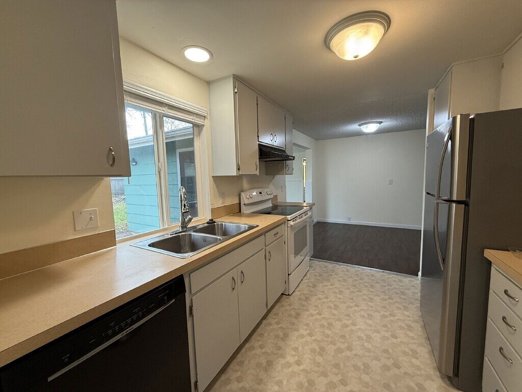 This single-family ranch-style home is located in the River Road area of Eugene and offers a functional one-level layout with approximately 1,307 square feet of living space. The home features three bedrooms and two bathrooms, along with a living room, dining room, and an additional family room with vaulted ceilings that create an open and comfortable feel. The kitchen includes Formica countertops, a smooth-top stove, refrigerator, dishwasher, and washer and dryer connections conveniently located just off the kitchen. Additional features include electric cadet wall and ceiling heat with no air conditioning, bay windows, blinds, and a non-functional pellet stove. The property also offers an attached two-car garage, a fenced yard, and a patio suitable for outdoor use. Built in 1969, this home provides two separate living areas and a practical layout. One well-behaved pet may be considered with an additional deposit. 3D Tour: *Applications accepted starting today until rented or three complete applications are received; applicants with limited English proficiency may request 24 extra hours (landlord not required to provide translation/interpretation). By submitting your information on this page you consent to being contacted by the Property Manager and RentEngine via SMS, phone, or email.