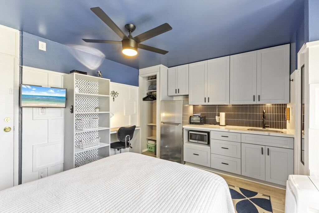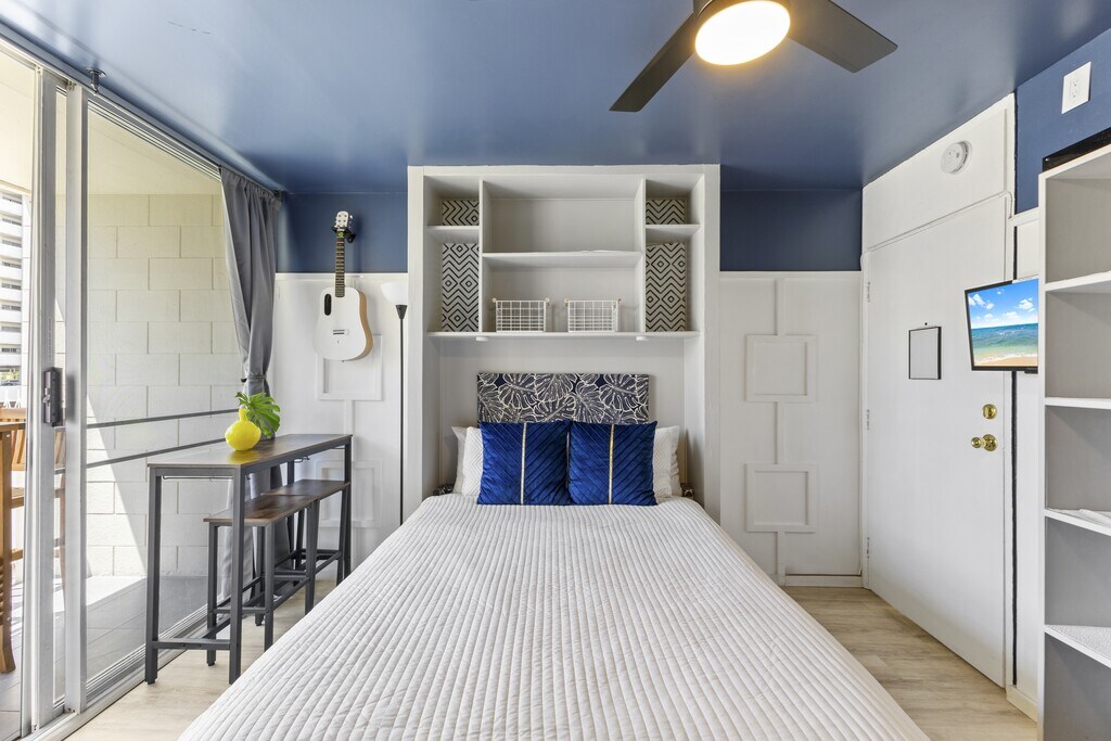 Location, location! Walk to the beach and shops from this fully remodeled studio unit. Just blocks away from famous Waikiki Beach, International Marketplace, shops, dining, Dukes and more. This studio sleeps 1-2 comfortably with a quality queen size bed. Private balcony, air conditioning, tiled walk-in shower, work desk, smart TV, Wi-Fi, fully equipped. The studio next door is also for rent. No Parking and community laundry in the building. Tenant is required to show proof of renter's insurance and pay for GE (and TA/OTA if less than 6 months lease).