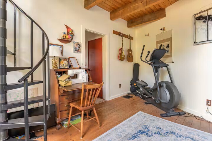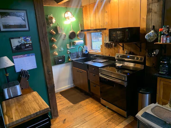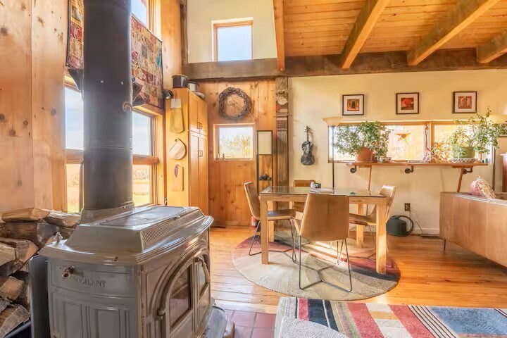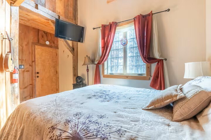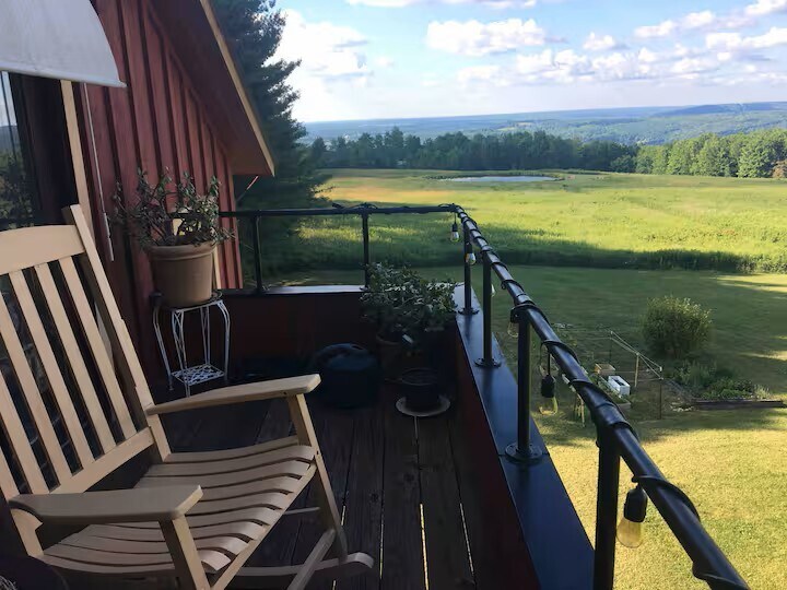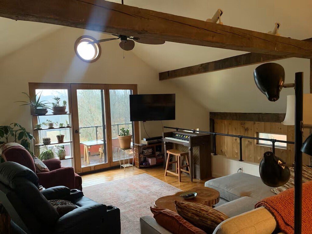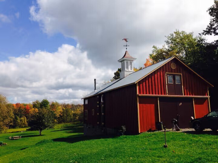 The barn is a cozy and unique space, situated on 27 acres of meadow and forest with a pond for swimming, fishing, and ice skating, depending on the season. There is no highway noise on the dirt road, and the stars shine brightly on clear nights, giving the place a true country feel, yet it’s still only a five minute drive from downtown Ithaca, Ithaca College, and Cornell University. Feel free to enjoy and play our piano, any stringed instruments, and extensive record collection! The space This 1830's barn was deconstructed and moved to this plot of land from Dryden, NY in 1991 and was then converted into a home. The big beams throughout the main living space are original. It sits on a dirt road that's very quiet with no highway noise, but it's a five minute drive from the downtown area, Ithaca College, and Cornell University. East Hill Plaza is also very close (for groceries, a gym, drug store, etc.) There are walking trails through our woods along a gorge (the tributaries of which connect with Six Mile Creek ... and speaking of Six Mile Creek, the winery by the name is a couple miles away, and several more wineries can be found around Cayuga and Seneca Lakes!) and a pond for swimming and fishing, or ice skating if you're staying in the winter. The wood stove makes for an extra cozy wintertime vibe if you're looking to curl up with a book and a cup of tea while the snow falls outside. There is a king sized bed in the master bedroom upstairs and a queen bed in the guest room downstairs. Just a heads up: the kitchen is small, and there is limited surface area, so we just use the dining table for food prep. The same can be said for the bathrooms: the downstairs full bath is European-style (with the shower and sink on one side of the hall and the toilet on the other, which actually has its perks!), and the upstairs half bath in the master bedroom is also very small. The barn itself has cozy, good vibes all around! If you wonder anything else about the house or the Ithaca area, we'd love to help. We adore this area and know it well, so if you like recommendations for for restaurants, wineries, hikes, sights, etc., please let us know.