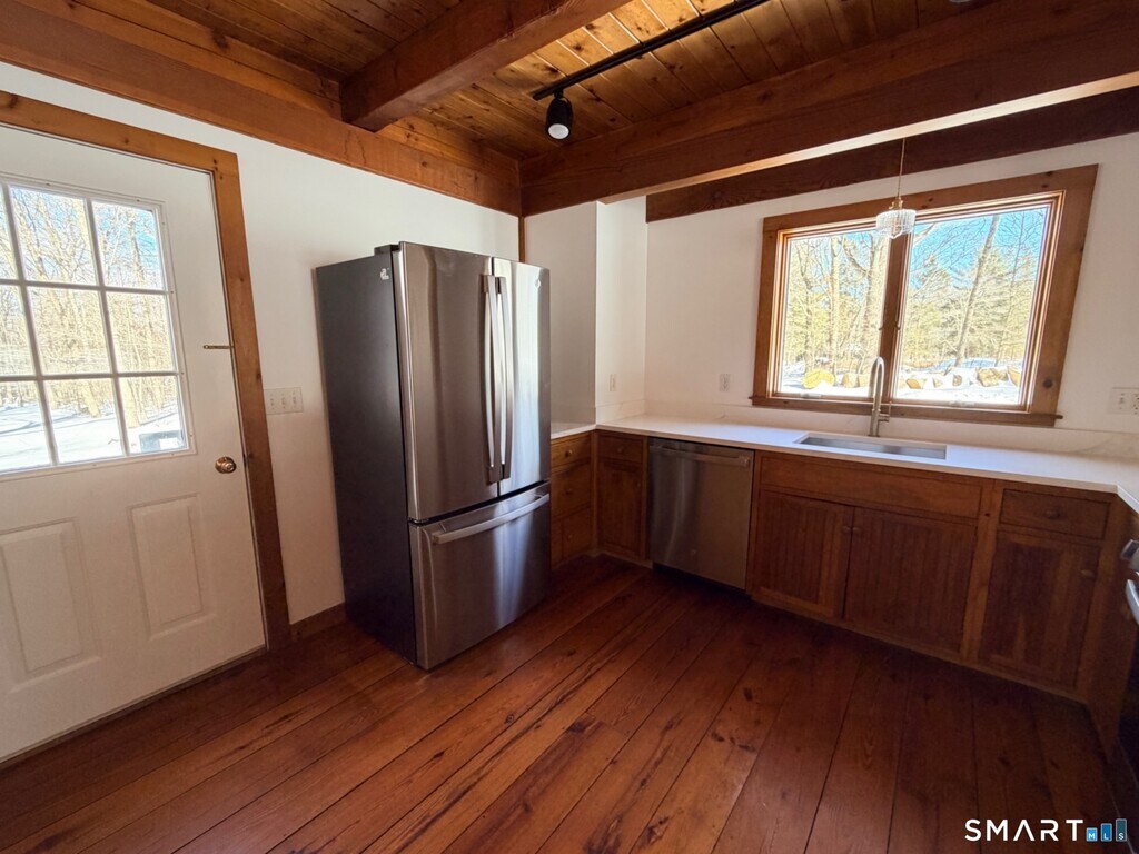 Call for Availability - This cozy Washington cottage has a lovely rustic charm. Newly painted and new appliances it's sparkling clean. It offers 2 bedrooms, 2 full refreshed baths and features beautiful wide-board wood floors, a striking 2-story stone fireplace, and vaulted ceilings that fill the space with light. Set back from the road on 4.6 peaceful acres, it offers privacy and a welcoming front porch. Just minutes to Washington Depot, New Preston, The Mayflower Inn and the town beach on Lake Waramaug. Shared driveway. MLS# 24150697