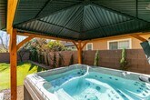 Located on a quiet cul-de-sac within a gated Inspirada community, this spacious and inviting home offers a bright, open floor plan designed for comfortable living. Dual sliding glass doors create seamless indoor-outdoor flow to a wrap-around patio with drop shades, gazebo, and jetted hot tub, perfect for relaxing or entertaining. The oversized kitchen features stainless steel appliances, granite countertops, ample cabinetry, and a breakfast bar, opening to a great room with a cozy gas fireplace and adjacent dining area. The private primary suite is separated from the secondary bedrooms and includes a large walk-in closet and an ensuite bath with dual vanities, a soaking tub, and a glass-enclosed shower. Low-maintenance landscaping, an EV charger in the garage, and access to Inspirada’s community amenities complete this well-appointed home.