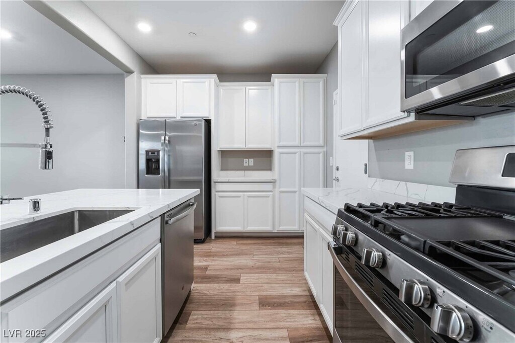 Located in the gated Santa Rosa community of Summerlin, this thoughtfully designed townhome offers mountain and city views along with 3 bedrooms, 2.5 bathrooms, and an open-concept layout ideal for everyday living and entertaining. The modern kitchen features quartz countertops, crisp white cabinetry, a large island with seating, and stainless steel appliances. The spacious primary bedroom and well-sized secondary bedrooms provide comfortable living spaces, while the attached two-car garage includes a tankless water heater for added efficiency. Community amenities include a pool, spa, and park, all conveniently situated near highly regarded Summerlin schools and just minutes from Downtown Summerlin.