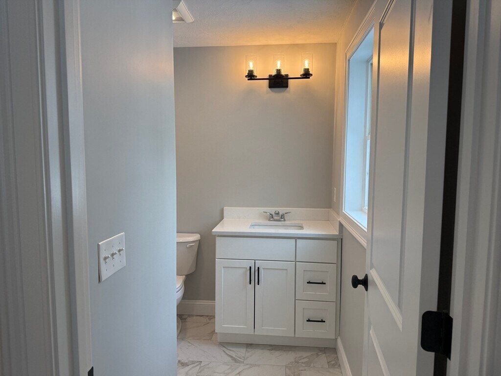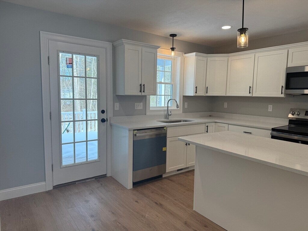 Exciting opportunity to rent a rare,brand-new 4-bedroom condominium offering 2,280 square feet of beautifully designed living space. This tastefully finished condo features a modern layout ideal for comfortable living and entertaining. The first floor offers a spacious primary bedroom with a private en-suite bath,along with a stunning kitchen featuring crisp white cabinetry,modern black hardware,stainless steel appliances,and a large island with quartz countertops. Ample cabinetry provides excellent storage. Sliding doors off the kitchen lead to a private balcony overlooking manicured lawns,perfect for relaxing or entertaining. A convenient half bath completes the main level. Upstairs are three generously sized bedrooms and a full hallway bath,offering flexible space for guests,family,or a home office. Additional highlights include central air conditioning and low-maintenance living. Ideally located minutes from a highway exit with easy access to Cape Cod,Boston,Plymouth,Etc MLS# 73476316