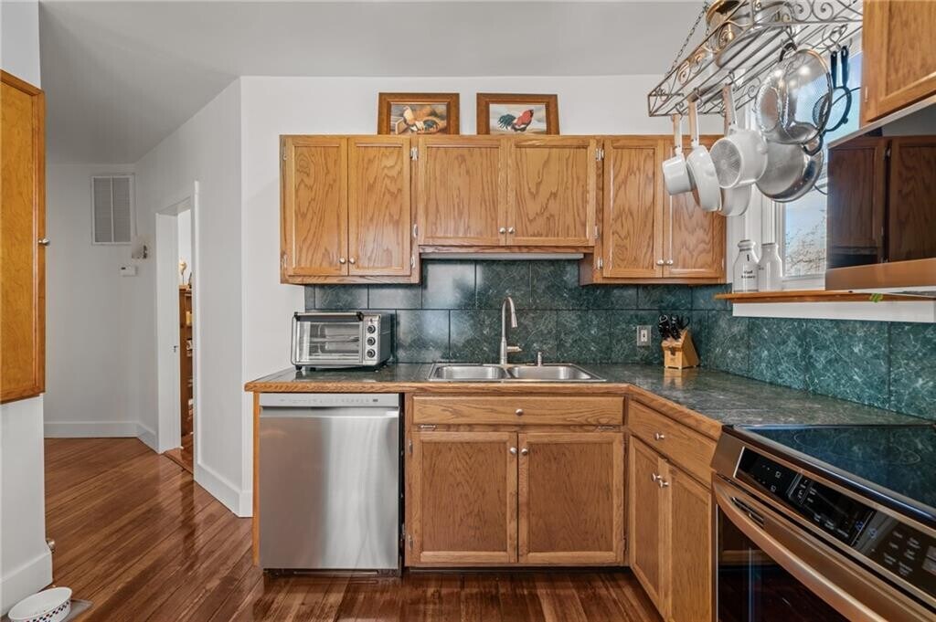 Available June 1 for a yearly lease,this charming Newport bungalow is tucked away on a quiet street just off Broadway. A welcoming front porch and bright,sun-filled interiors create an inviting place to call home. Inside,the home offers gleaming hardwood floors,thoughtful updates,fresh paint throughout,and central A/C. The first floor features a spacious living room,formal dining room,and a well-appointed kitchen with ample cabinetry and new appliances. A first-floor bedroom and additional guest room or office provide flexible living space and connect to a staircase leading to the upstairs suite. The second level functions as a private retreat,complete with a primary bedroom,recently updated bathroom,office nook,lounge area,custom closet,and a cozy reading space. Outside,enjoy a fully fenced private backyard,rear deck,woodshop,and storage shed,along with two off-street parking spaces. Additional clean,dry basement storage and laundry add convenience. 25 Peckham is near Broadway’s restaurants and shops,area beaches,the Naval Base,and bridge access.. Tenants responsible for all utilities. Sorry,no pets. MLS ID 1405090