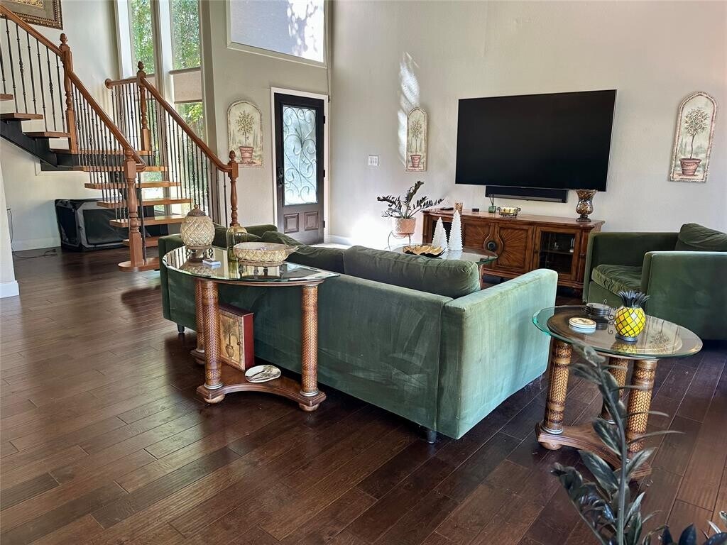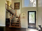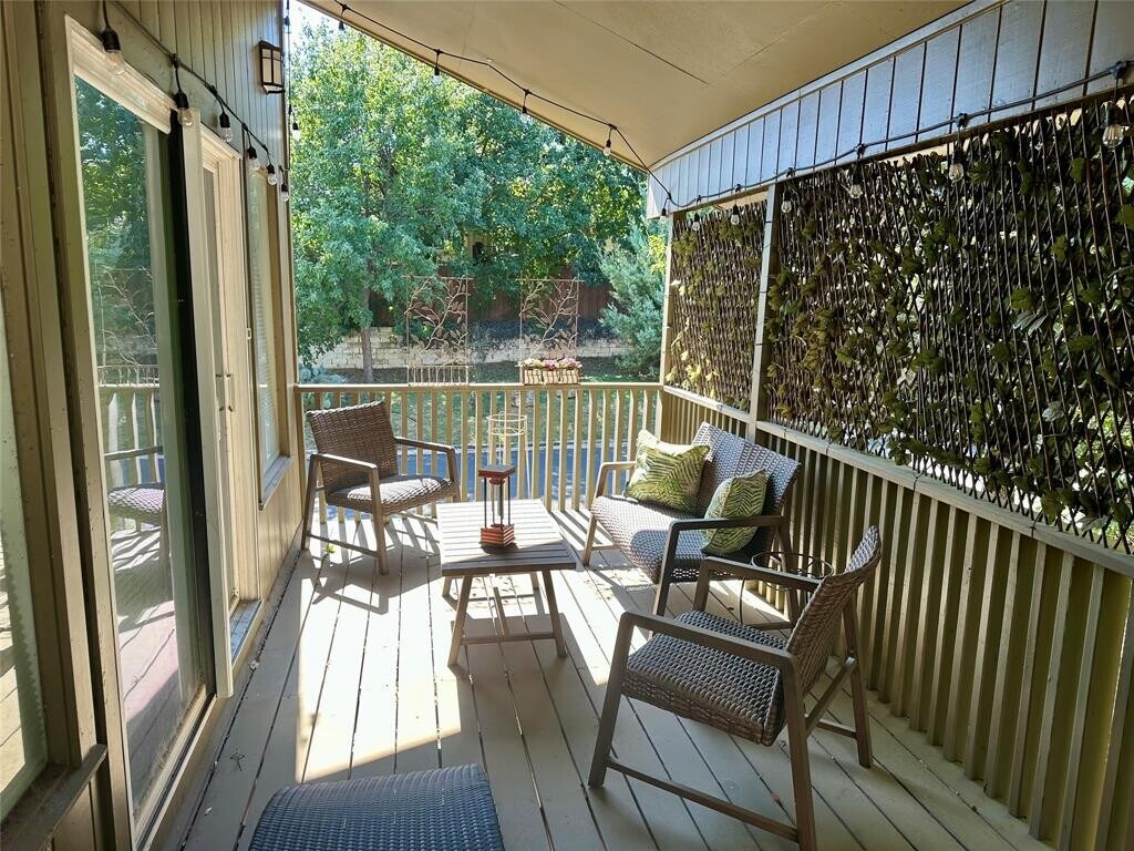 Architectural condominium with a tree-house style feel in a quiet Lakeway community. Large windows and high ceilings create an open, light-filled interior. Features include a custom red oak and wrought iron staircase with a reading nook, a breakfast bar overlooking the garden courtyard, and soft-close cabinetry with added storage. The upstairs deck overlooks the courtyard and shades a small downstairs patio, complete with a propane fire pit and grill. Furnishings are included, along with water and electric. The community offers a pool, trails running alongside the property, and a pond across the street. Residents also enjoy proximity to Lake Travis, multiple golf courses available with a Hills Country Club membership, parks, dining, and shopping. Downtown Austin is just 30 minutes away.